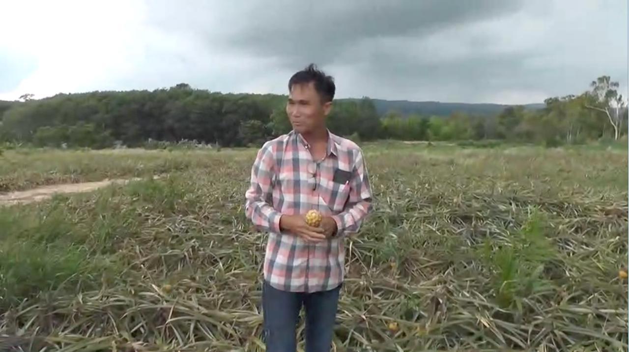 นายสุเมฆ แสนมาตย์ อายุ 49 ปี ชาวบ้าน หมู่ 3 บ้านห้วยหมากแดง ต.ท่าหินโงม อ.เมือง จ.ชัยภูมิ กล่าวว่า ไร่สวนสับปะรดของตนมีพื้นที่กว่า 20 ไร่ ที่ทุกปี จะเป็นช่วงที่กำลังให้ผลผลิต ให้ลูกสับปะรดตัดขายส่งโรงงานและขายให้ผู้บริโภคที่พ่อค้าคนกลางจะนำรถมาซื้อถึงสวนแล้ว แต่ปีนี้จากภัยแล้งยาวนานมาตั้งแต่ต้นปี ต้นสับปะรดขาดแคลนน้ำ ต้นสับปะรดไม่เจริญเติบโต และเมื่อออกลูกออกมาจะมีขนาดเล็กมาก มีขนาดใหญ่กว่าผลส้มเล็กน้อยเท่านั้นขายไม่ได้ ไม่มีใครรับซื้อ