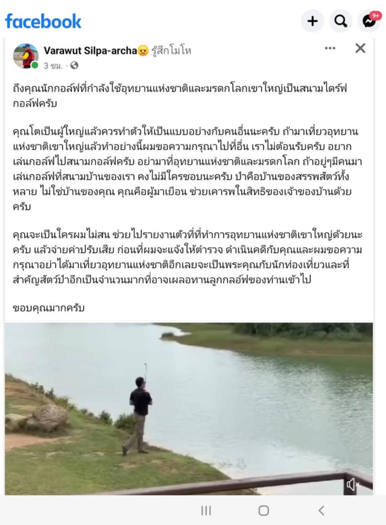 จากกรณีเมื่อบ่ายวานนี้ (14 กรกฏาคม 2566) เจ้าหน้าที่อุทยานแห่งชาติเขาใหญ่ ได้รับแจ้งจากนักท่องเที่ยวว่า มีชายนำไม้กอล์ฟมาตีกอล์ฟริมอ่างเก็บน้ำสายศร บนอุทยานฯ เขาใหญ่ มีนักท่องเที่ยวถ่ายรูปได้ทั้งเป็นคลิปวิดีโอ ภาพนิ่ง