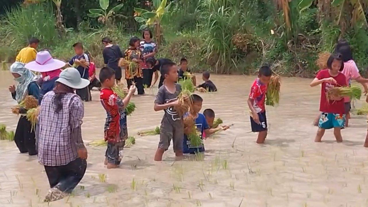 พร้อมกับนำเด็กนักเรียน มาสอนตั้งแต่เริ่มปฏิบัติโดยการถอนกล้า แยกกล้า มัดกล้า ตลอดจนลงมือดำนา ซึ่งในการเรียนการสอนในครั้งนี้ ต่างได้รับความร่วมมือจากพี่น้องประชาชนคนใน 3 ตำบล มีตำบลคาละแมะ ตำบลหนองบัว และตำบลตรึม เป็นอย่างดี ช่วยสอนลงมือปฏิบัติจริงให้กับเด็กได้เรียน ซึ่งการลงมือปฏิบัติในครั้งนี้ เด็กๆ ทุกคน จะได้ซึมซับวิถีชาวนาของบรรพบุรุษของตนเอง ว่ามีความยากลำบากแค่ไหน กว่าจะได้สืบทอดมาจากรุ่นมาสู่รุ่นถึงปัจจุบันนี้ และได้ขึ้นชื่อว่ากระดูกสันหลังของชาติอีกด้วย