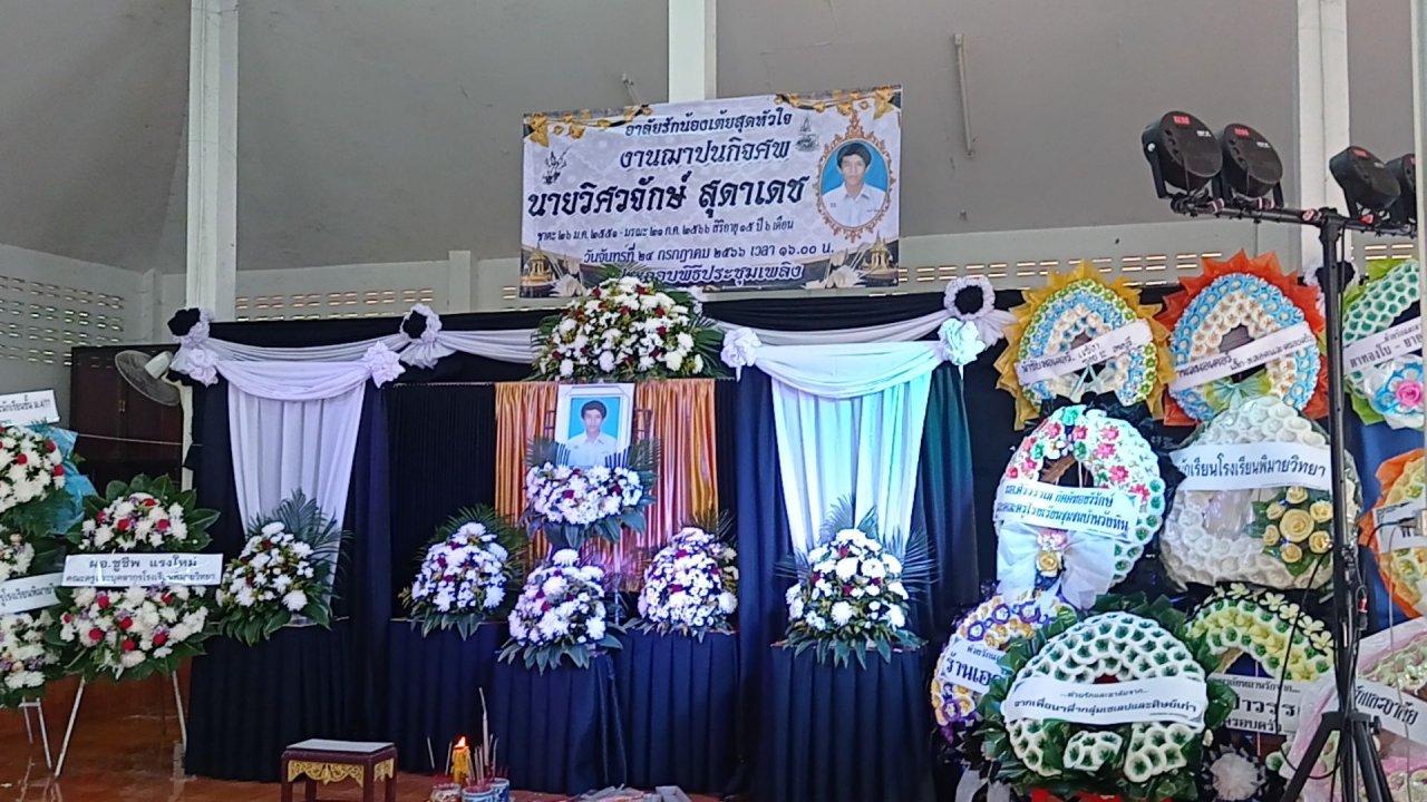 เมื่อเวลา 09.00 น. วันที่ 23 ก.ค. 66 ผู้สื่อข่าวเดินทางไปที่วัดวังหิน ม.8 ต.ในเมือง อ.พิมาย จ.นครราชสีมา ที่สถานที่ตั้งศพและบำเพ็ญกุศลศพ นายวิศวจักษ์ สุดาเดช (เต้ย) อายุ 15 ปีนักเรียน ม.4 ที่ศาลาการเปรียญ วัดวังหิน