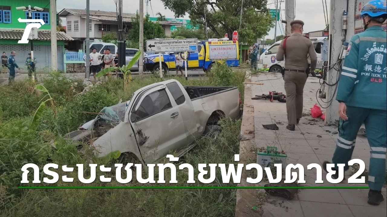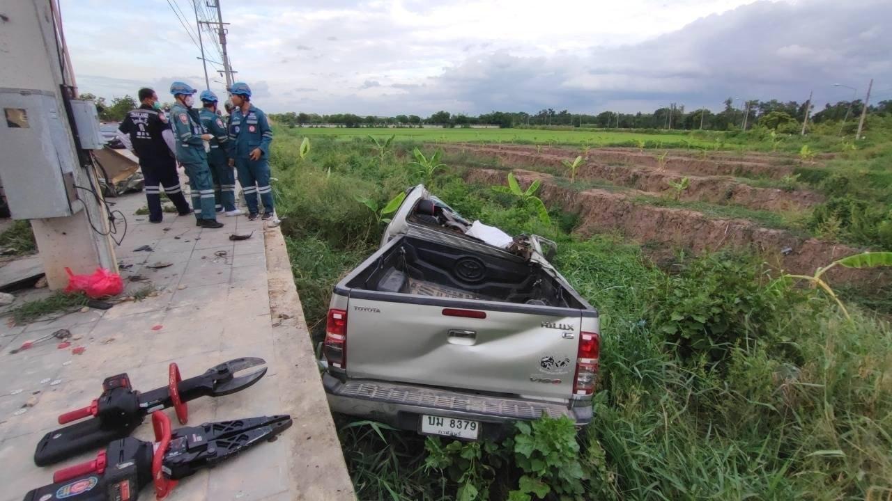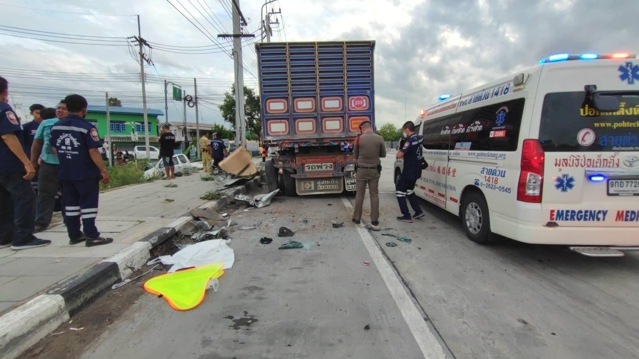 กระบะชนท้ายรถบรรทุกพ่วง ที่จอดอยู่ริมถนนวงแหวนตะวันตก มุ่งหน้าลาดหลุมแก้ว ทางเข้า สภ.สามโคก โดยมีผู้บาดเจ็บ 3 ราย เสียชีวิตคาที่ 2 ศพ กู้ภัยต้องนำเครื่องตัดถ่างงัดร่างนำศพออกมา ก่อนนำศพไปเก็บไว้ที่ สถาบันนิติวิทยาศาสตร์ รพ.ธรรมศาสตร์เฉลิมพระเกียรติ
