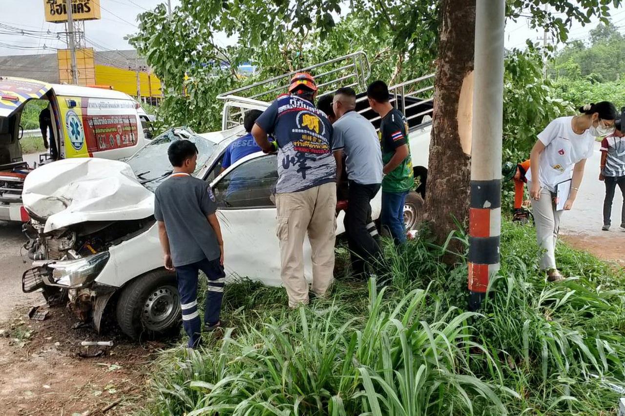 เหตุสลด เพิ่งถอยกระบะคอกมือสองจากเต็นท์ ขับออกมาได้ไม่ถึง 5 นาที เสียหลักขึ้นเกาะกลางถนน ชนต้นไม้ดับ 1 สาหัส 1