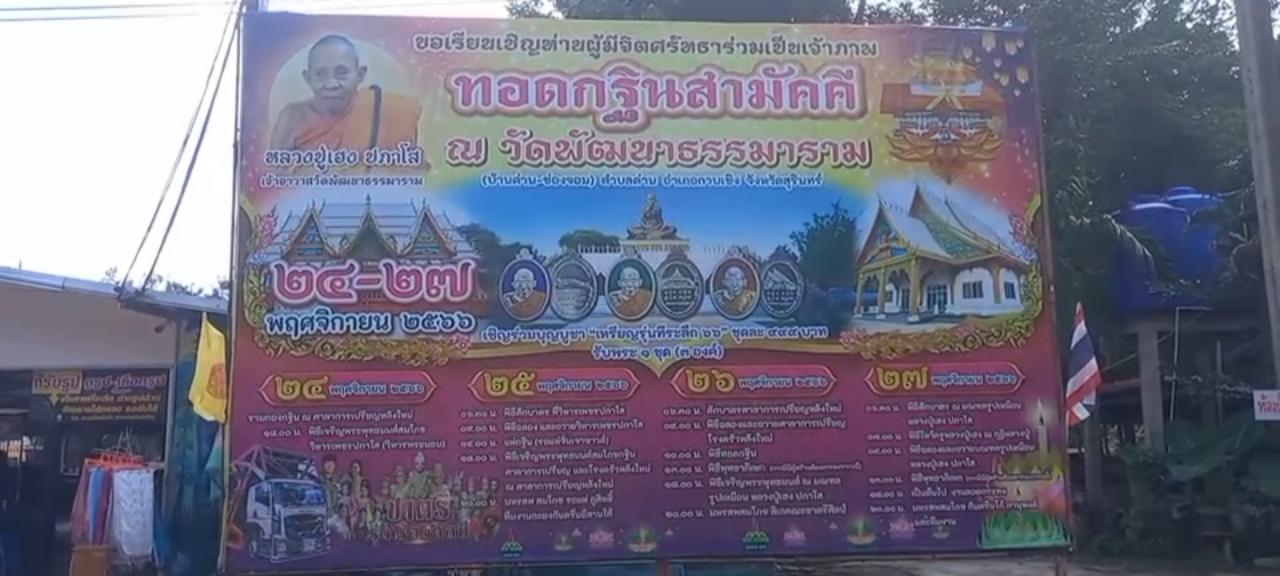 สำหรับหลวงปู่เฮง ปภาโส เจ้าอาวาสวัดพัฒนาธรรมาราม หรือวัดบ้านด่านช่องจอม สิริอายุ 96 ปี ซึ่งเป็นผู้ที่ได้ชื่อว่าเป็น เทพเจ้าแห่งโชคลาภของแดนดินถิ่นอีสานใต้ วัดตั้งอยู่ที่บ้านด่านช่องจอม ต.ด่าน อ.กาบเชิง จ.สุรินทร์ หลวงปู่เฮง เกิดเมื่อเดือนสิงหาคม 2470 ปีเถาะ พ่อแม่เป็นชาวกัมพูชา แต่ได้อพยพมาอยู่ประเทศไทยในสมัยที่ฝรั่งเศสปกครอง โดยย้ายมาอยู่หมู่บ้านปราสาท ต.ตาอ็อง อ.เมือง จ.สุรินทร์ ประกอบอาชีพทำนาทำสวน มีพี่น้องด้วยกัน 13 คน เป็นบุตรคนที่ 7 ที่หมู่บ้านปราสาท ในวัยเด็กอายุประมาณ 13-14 ปี พระอาจารย์เฉิด ธัมมกโร ลูกพี่ลูกน้องของหลวงปู่เฮง เดินทางธุดงค์มาจากประเทศกัมพูชา เข้ามาเยี่ยมญาติพี่น้องที่ประเทศไทย บอกจะเดินธุดงค์ไปเรื่อยๆ ก่อนที่จะไปได้ขอกับแม่ของท่าน โดยขอให้น้องไปด้วย และจะได้สอนให้ได้หัดเรียนเขียนอ่านหนังสือ ทำให้ได้ศึกษาอักษรขอม ศาสตร์วิชาแขนงต่างๆ ตั้งแต่บัดนั้น ศึกษากับพระอาจารย์เฉิด พระพี่ชาย และออกธุดงค์ไปด้วยเสมอ