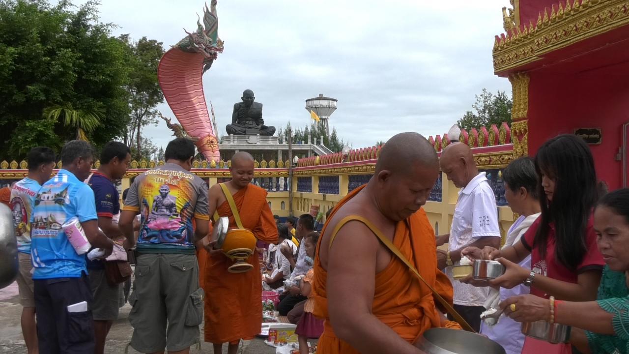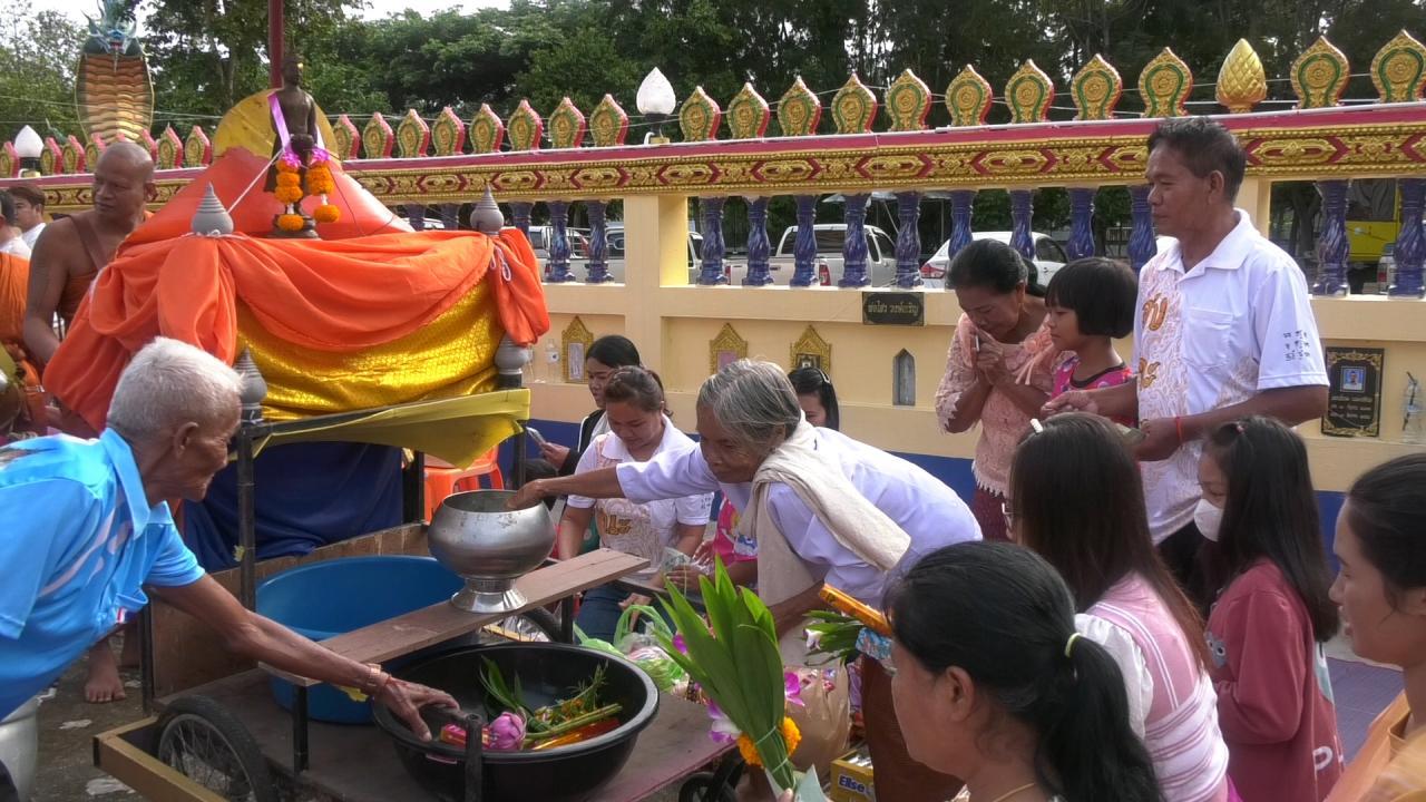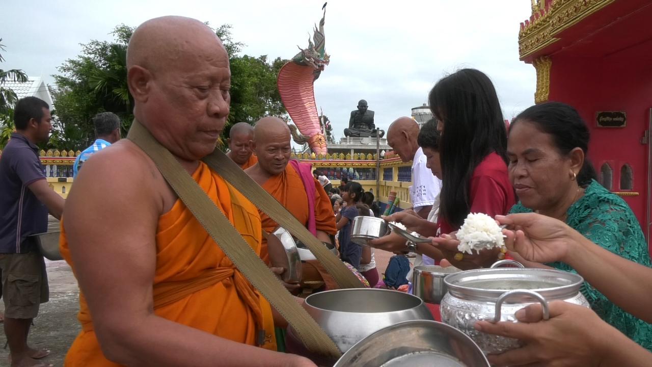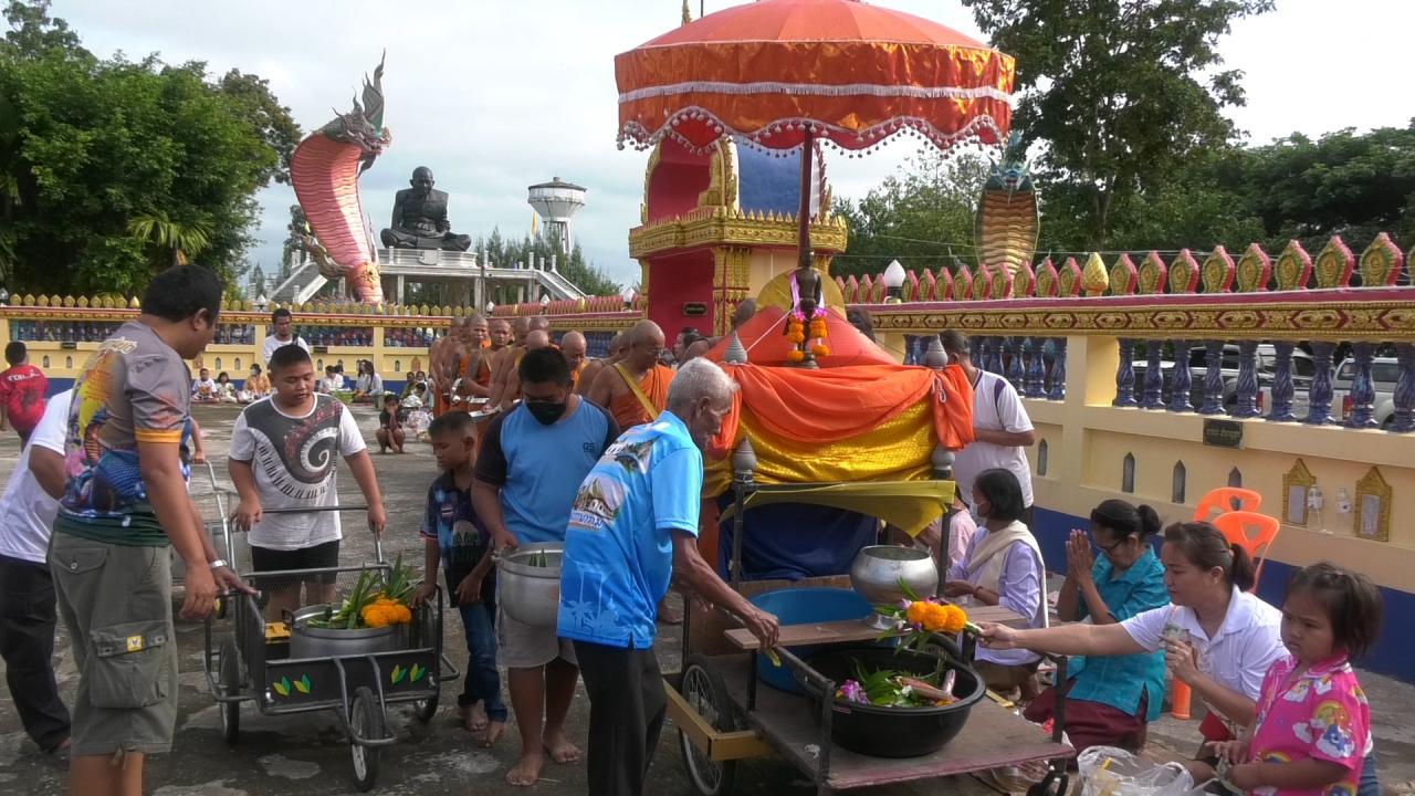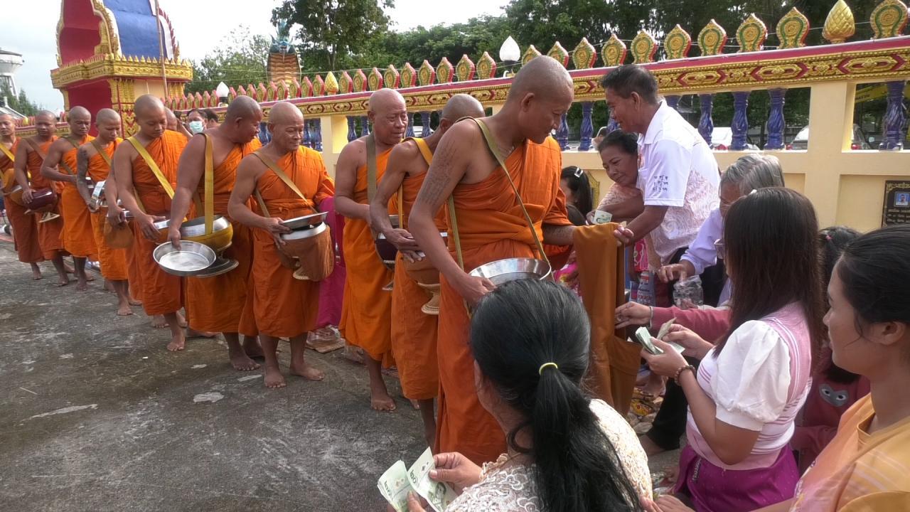 บรรยากาศเป็นไปอย่างอบอุ่น โดยเฉพาะการตักบาตรข้าวสารอาหารแห้ง ที่พบว่ามีจำนวนมากจนเต็มกระบะรถ ซึ่ง นายศิริวุฒิ วงษ์เจริญ กำนัน ต.ด่าน ในฐานะประธานกรรมการวัด ได้ประชาสัมพันธ์บอกประชาชนที่มาร่วมทำบุญตักบาตรให้ทราบว่า ข้าวสารอาหารแห้งบางส่วนทางวัดจะนำไปบริจาคต่อ เพื่อช่วยเหลือผู้ประสบอัคคีภัย หลังตลาดการค้าชายแดนช่องจอมถูกเพลิงไหม้ ซึ่งส่วนใหญ่เป็นชาวกัมพูชาที่กำลังเดือดร้อน