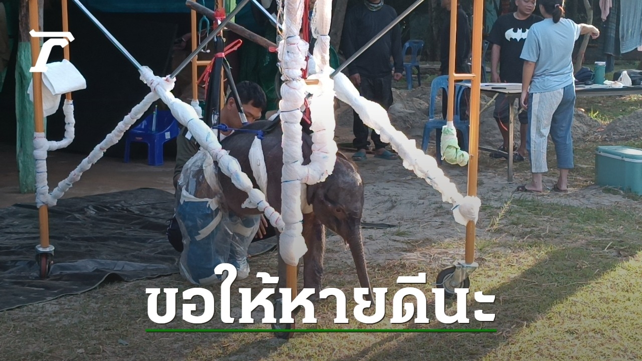 "น้องพลายเดือน" ลูกช้างป่าพลัดหลงโขลง ที่ทับลาน ใส่เฝือกสำเร็จด้วยดี-อาการปลอดภัย ทีมสัตวแพทย์เฝ้าดูอาการอย่างใกล้ชิด คาดใส่อีกครั้งกลางเดือนหน้า