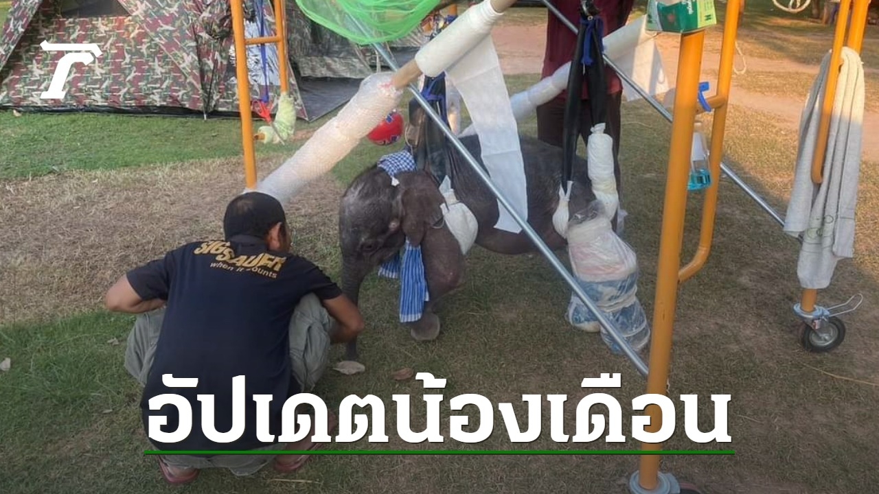 เมื่อวันที่ 30 พ.ย.66 ทีมสัตวแพทย์กรมอุทยานแห่งชาติ สัตว์ป่า และพันธุ์พืช รายงานข้อมูลลูกช้างป่า ชื่อ "เดือน" เพศผู้ วัยเด็ก พบเจอบริเวณท้องที่บ้านตลิ่งชัน ต.จระเข้หิน อ.ครบุรี จ.นครราชสีมา "ลูกช้าง" มีความอยากกินนมปกติ อุจจาระเหลวในช่วงเช้ามืด และเริ่มมีอุจจาระเป็นเนื้อในช่วงเย็น จึงยังมีงดนมและให้น้ำเกลือแบบมีน้ำตาล ปัสสาวะปกติ กิจวัตรประจำวันในการดูแลลูกช้าง มีการพาเดินเล่นช้าๆ โดยยังอยู่บนอุปกรณ์ช่วยพยุงอยู่ตลอดเวลา โดยยกสองขาหลังที่เข้าเฝือกเหนือพื้นเล็กน้อย ขาหน้าไม่มีการดึงรั้งสามารถลงน้ำหนักได้เต็ม 2 ฝ่าเท้า ทำความสะอาดลดความชื้นของเฝือก การเปลี่ยนถุงหุ้มเฝือกเพื่อลดการปนเปื้อนสิ่งสกปรก เช็กระดับรอกให้เหมาะสมทุกครั้งในการยืน และสลับให้เปลพยุงเพื่อลดแผลกดทับบริเวณขาหนีบ
