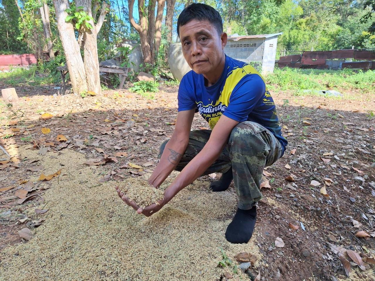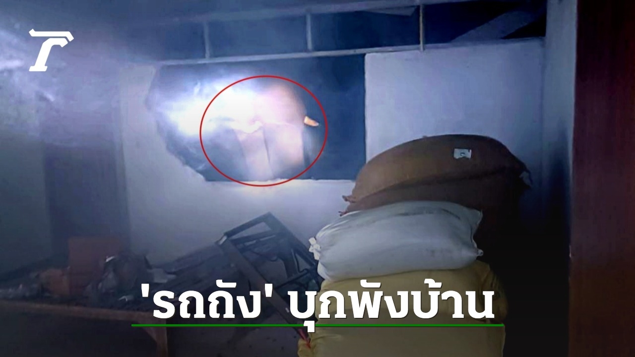 สภาพบ้านถูกพังมาจากหลังบ้าน กำแพงบ้านถูกพัง หน้าต่างกระจกอะลูมิเนียมเสียหาย มีข้าวเปลือกประมาณ 2 กระสอบ หล่นเกลื่อนทั่วบริเวณบ้าน