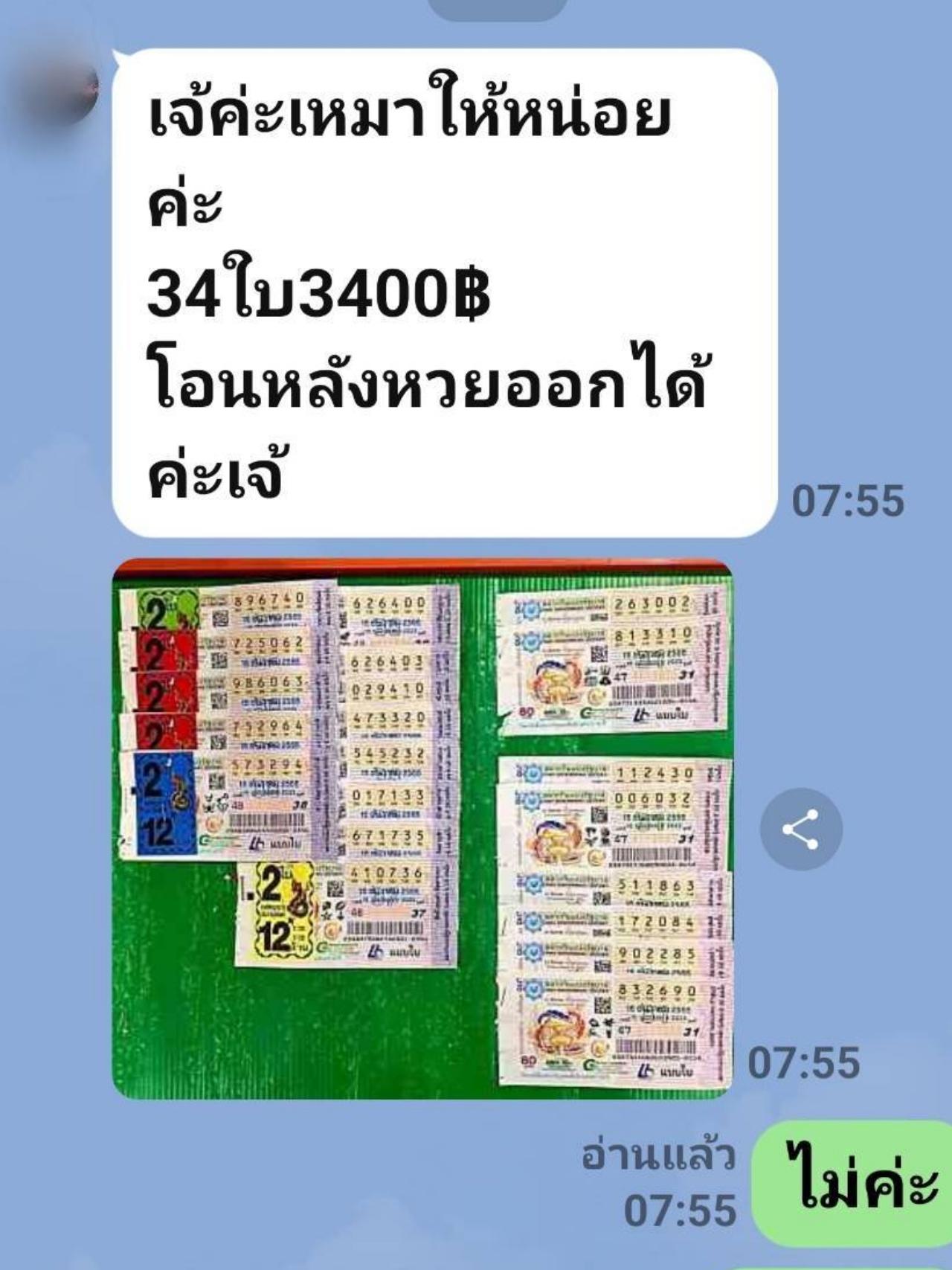 สาวนักธุรกิจอสังหาฯ เดือด ช่วยแม่ค้าที่รู้จักกันซื้อลอตเตอรี่ผ่านไลน์ทุกงวด ไม่ถูกก็จ่ายเงินไม่เคยเบี้ยว แต่พอถูก 5 ใบ ได้เงินเกือบ 2 หมื่น กลับเบี้ยว อ้างแฟนขายเงินสดไปแล้ว เลยนำหลักฐานเข้าแจ้งความ ล่าสุดแม่ค้าติดต่อขอเจรจา