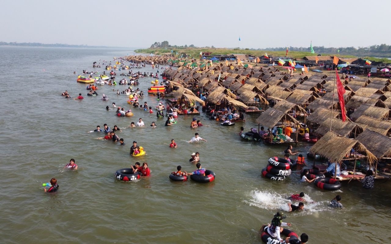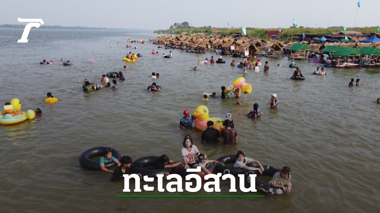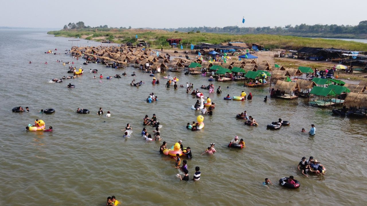 นครพนม หนีร้อนพึ่งเย็น อากาศร้อนจัด 40 องศาฯ นักท่องเที่ยวหนีร้อน แห่เล่นน้ำหาดแห่ กลางน้ำโขง อันซีนทะเลอีสาน ค้าขายคึกคัก เงินสะพัดวันละหลายแสน สร้างรายได้ในชุมชนยาวถึงหน้าฝน