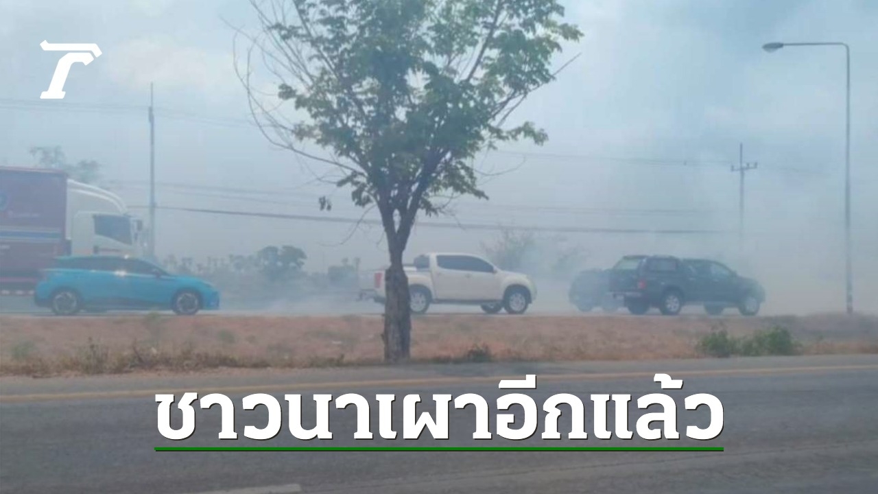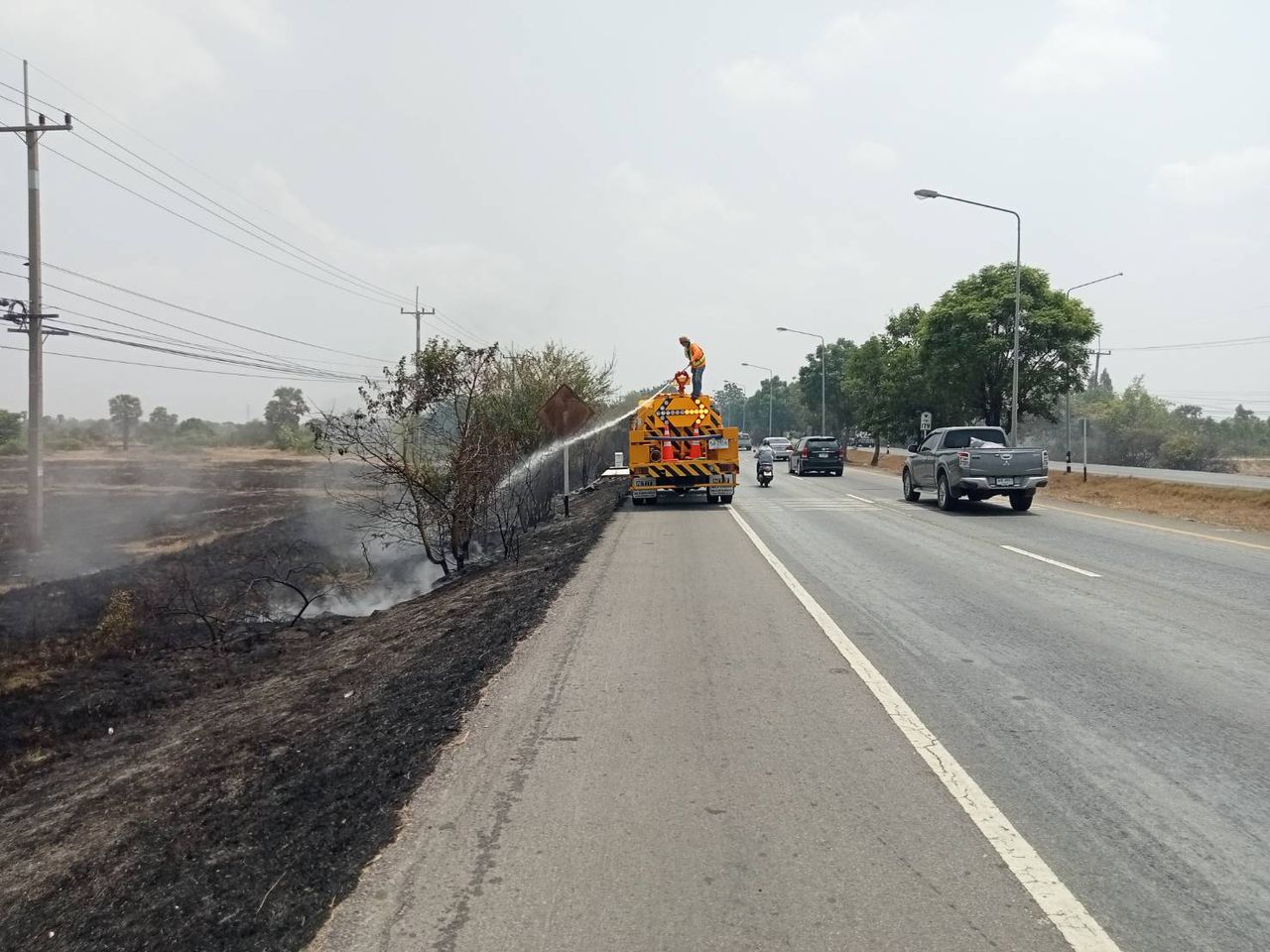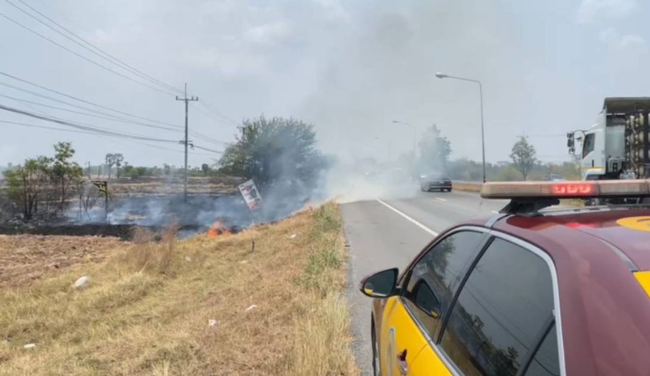 ระทึก ไฟไหม้หญ้าข้างทาง ควันปกคลุมถนนมิตรภาพ ทำรถติดยาวหลายกิโลเมตร เจ้าหน้าที่เร่งฉีดน้ำควบคุมเพลิง คาดชาวนาลอบจุดไฟเผาตอซังข้าว ทำไฟลามไหม้หญ้าแห้งริมทาง
