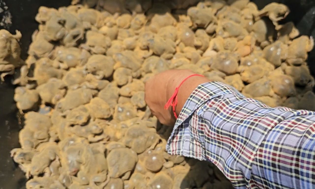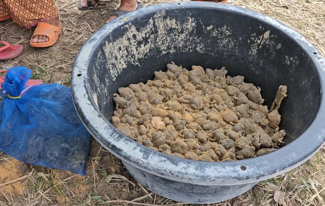 วันที่ 13 พฤษภาคม 2567 ผู้สื่อข่าวพบรถกระบะจอดริมถนนที่อ.ลำดวน จ.สุรินทร์ มีชาวบ้านรุมกันที่กะละมังใบใหญ่ พบว่าภายในกะละมังมีอึ่งไข่จำนวนมาก