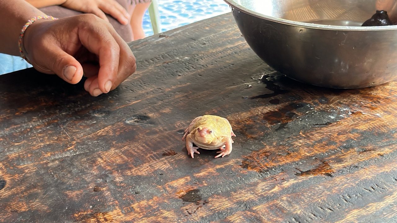 ต่อมา วันที่ 24 พฤษภาคม 2567 ผู้สื่อข่าวเดินทางไปพบกับชาวบ้านที่จับอึ่งเผือกตัวนี้ได้ ที่บ้านเลขที่ 11 ม.3 ต.บ้านดง อ.อุบลรัตน์ จ.ขอนแก่น โดยได้พบกับ นายไพสาร มะเนตร อายุ 53 ปี และนางกรรณิการ์ มะเนตร อายุ 50 ปี สองสามีภรรยาเจ้าของบ้าน โดยนายไพสาร เป็นคนจับอึ่งอ่างเผือกตัวนี้ได้ที่ป่าชุมชนที่ชาวบ้านเรียกว่า โสกนกเค้า บ้านขุนด่าน ม.1 ต.บ้านดง เมื่อคืนที่ผ่านมา ภายหลังจากที่มีฝนตกในพื้นที่เมื่อช่วง 20.00 น. วานนี้ (23 พ.ค. 2567) โดยบรรยากาศมีชาวบ้านที่ทราบว่านายไพสารจับอึ่งอ่างเผือกตัวนี้ได้ ต่างมาชมความสวยงามของเจ้าอึ่งอ่างตัวนี้ ซึ่งเป็นอึ่งเพ้า สีเผือกทั้งตัว และมีสีเหลืองทองอยู่บนผิวหนังแผ่นหลังของอึ่งอ่าง ซึ่งทั้งเจ้าของบ้านและชาวบ้านต่างบอกว่าอึ่งอ่างตัวนี้ ตัวเป็นอึ่งอ่าง แต่ขาเป็นกบ ลักษณะคล้ายกับกลายพันธุ์เป็นอึ่งอ่างกึ่งกบ พร้อมกันนี้ นางกรรณิการ์ ได้นำแป้งมาโรยผิวหนังด้านบนและท้องของอึ่งอ่างเผือก เพื่อหาตัวเลขนำโชคของแต่ละคน ซึ่งชาวบ้านได้ทั้งเลข 23 57 และบางคนเห็นแต่ไม่เปิดเผยเนื่องจากมีเคล็ดลับว่าเดี๋ยวตัวเลขมันจะเคลื่อน และเหมือนฟ้าเป็นใจ แม่ค้าสลากขับรถจักรยานยนต์นำสลากฯ มาขายและมีตัวเลขตรงกับที่ชาวบ้านเห็นได้พากันเสี่ยงดวงซื้อสลากกินแบ่งรัฐบาลกันไปคนละใบสองใบ ก่อนจะแยกย้ายกันกลับบ้าน