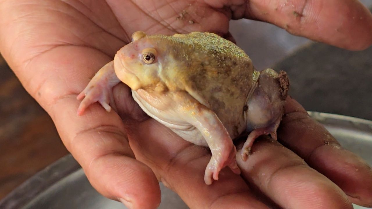 ชาวบ้านที่ อ.อุบลรัตน์ จ.ขอนแก่น ออกหาอึ่ง เจออึ่งเผือกกำลังร้องประสานเสียงกับพรรคพวก จับมาไม่กล้าต้มกินเชื่อจะให้โชค นำแป้งมาถูหาตัวเลข เตรียมปล่อยในสวนตามธรรมชาติ พบอึ่งอ่างเผือกมีขาหลังเหมือนกบ และดวงตาโตกว่าอึ่งอ่างทั่วไป