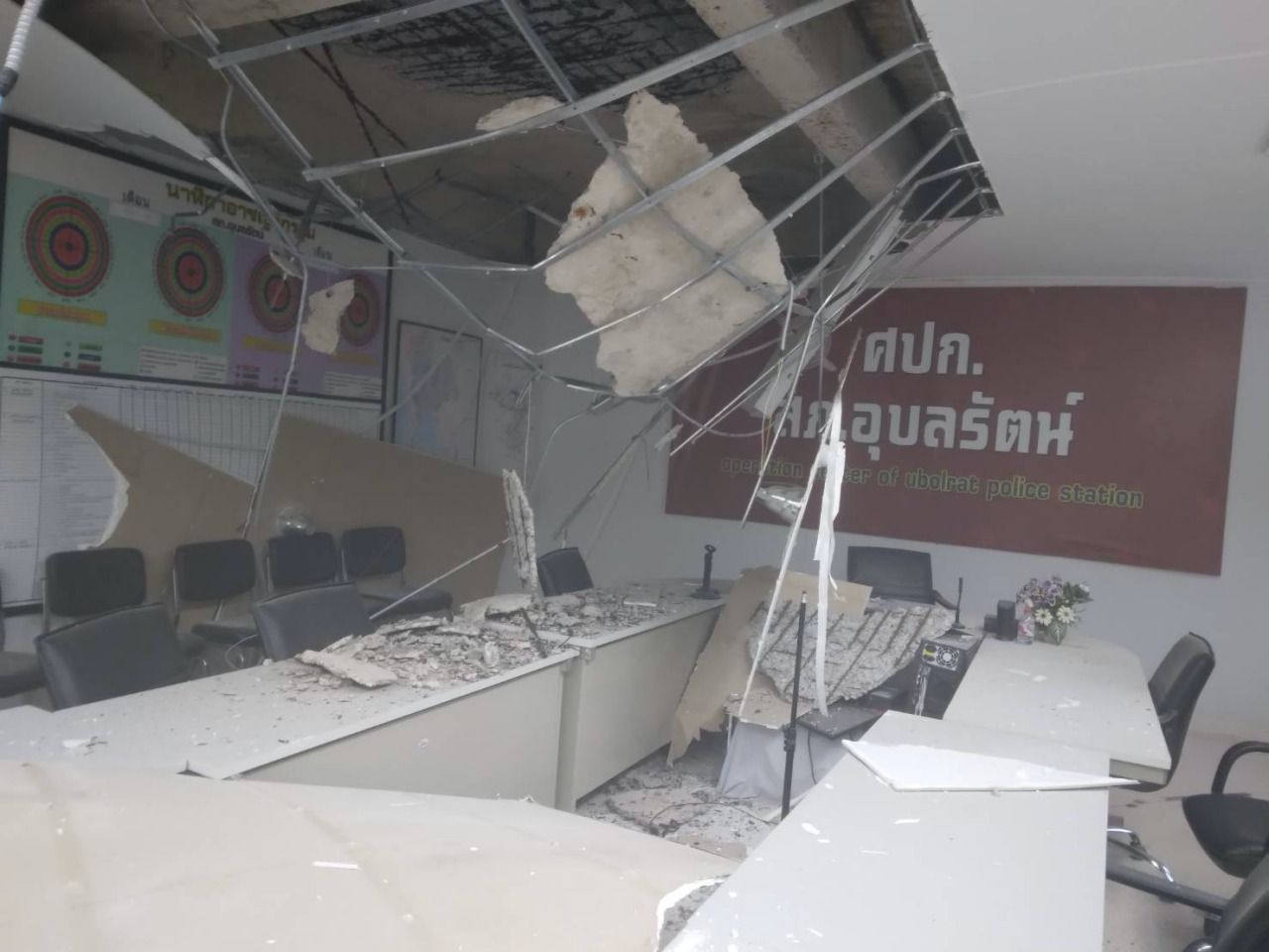 อาคารที่ทำการ งบก่อสร้าง 30 กว่าล้าน คอนกรีตไม่ได้มาตรฐาน ทำคานทรุด เพดานพัง ผนังร้าว พังทั้งหลัง ตำรวจเสี่ยงตายทำงานรับใช้ประชาชน สุดท้าย ผกก.ต้องหอบลูกน้องนั่งในห้องประชุม