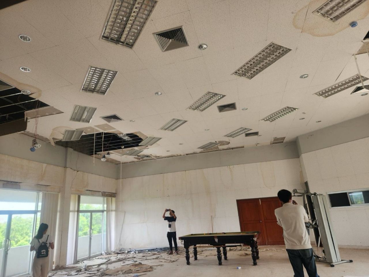 ในส่วนของชั้นที่ 4 ซึ่งเป็นห้องประชุมใหญ่และห้องสันทนาการนั้น พบว่า เสียหายอย่างหนักเช่นกัน ฝ้าเพดานพังหลุดลงมา คานร้าว จนไม่สามารถใช้งานได้