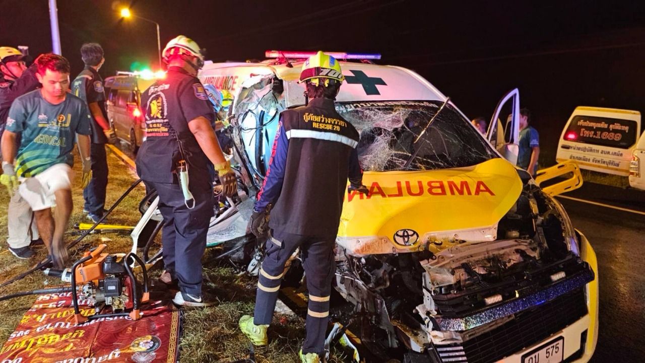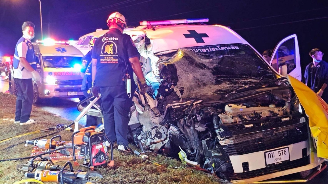 เมื่อวันที่ 15 มิ.ย. 67 เวลาประมาณ 22.30 น. ที่ผ่านมา พ.ต.ท.อนิรุต ผดุงดี รอง ผกก.(สอบสวน) สภ.เมืองบุรีรัมย์ อ.เมืองบุรีรัมย์ รับแจ้งจากชาวบ้านว่ามีอุบัติเหตุรถตู้เฉี่ยวชนกับรถฉุกเฉินโรงพยาบาล มีผู้ติดภายในและได้รับบาดเจ็บหลายราย จึงประสานหน่วยกู้ภัยสว่างจรรยาบุรีรัมย์นำชุดอุปกรณ์ตัดถ่างสนับสนุนที่เกิดเหตุ