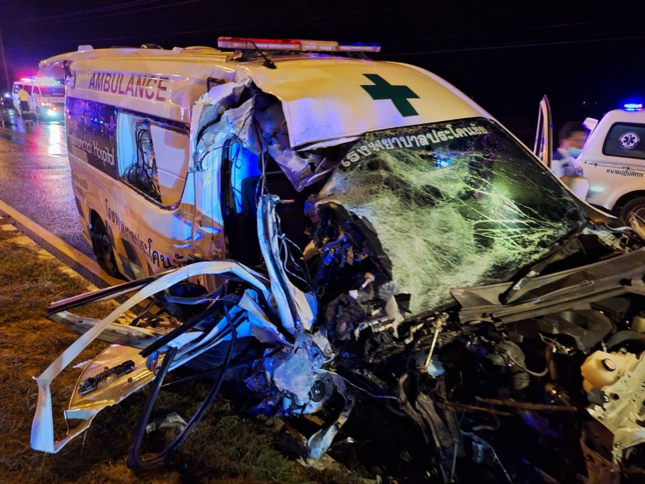 เกิดอุบัติเหตุรถฉุกเฉินโรงพยาบาลประโคนชัย นำคนไข้ส่งต่อโรงพยาบาลศูนย์บุรีรัมย์ ขณะฝนตก ถูกรถตู้ครูโรงเรียนดังเฉี่ยวชนพังยับเยินทั้ง 2 คัน ครูเสียชีวิตคารถ ส่วนรถฉุกเฉินบาดเจ็บ 4 ราย