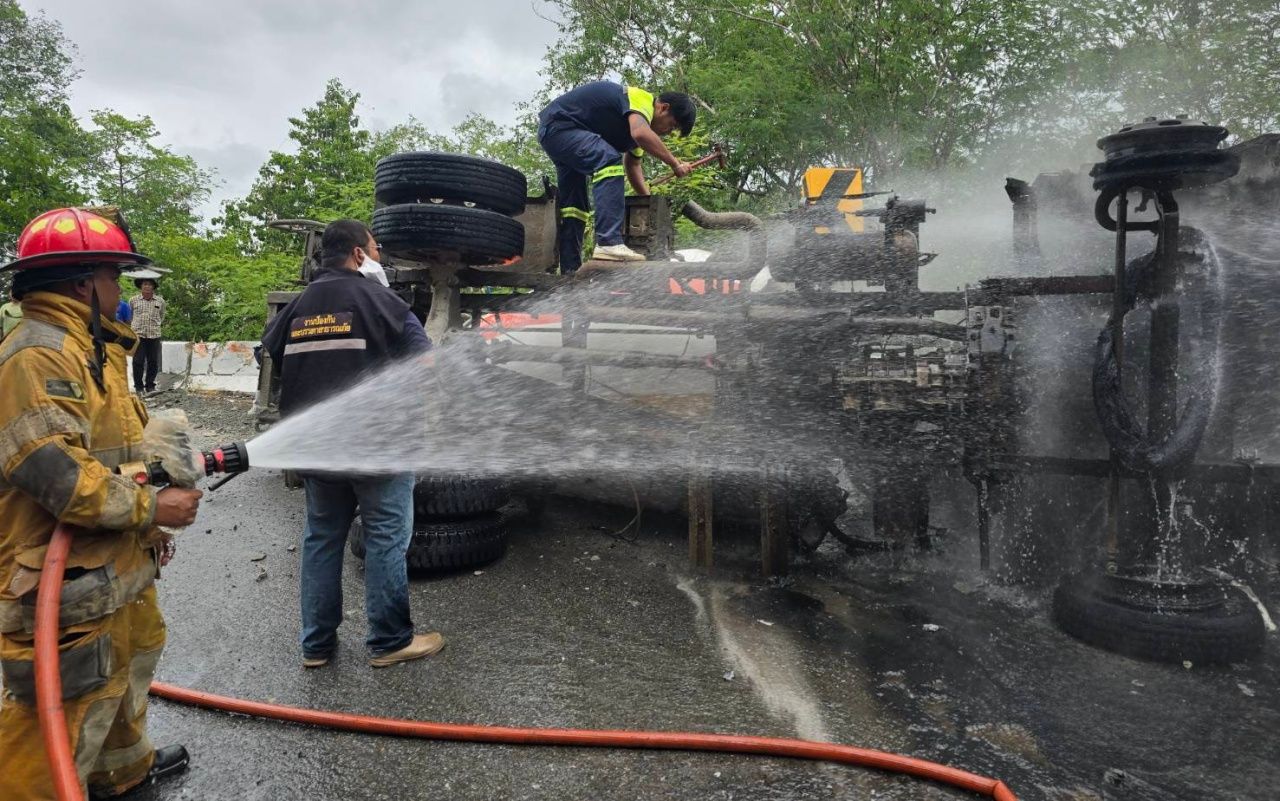 เวลา 11.00 น. วันที่ 26 มิ.ย. 67 พ.ต.ท.พนม สิงหเศรษฐกิจ สว.(สอบสวน) สภ.ปากช่อง จ.นครราชสีมา ได้รับแจ้งว่ามีเหตุรถบรรทุกโม่ปูนพลิกคว่ำ และเกิดไฟลุกไหม้ ที่ถนนปากช่อง-บ้านลำทองหลาง คนขับติดภายในยังช่วยออกมาไม่ได้ หลังรับแจ้งจึงรายงานผู้บังคับบัญชา แล้วรีบรุดออกไปตรวจสอบ พร้อมด้วย พ.ต.อ.วีระพล ระเบียบโพธิ์ ผกก.สภ.ปากช่อง และเจ้าหน้าที่ตำรวจ หน่วยกู้ชีพ อบต.ปากช่อง อบต.มวกเหล็ก หน่วยกู้ภัยมูลนิธิสว่างวิชชาธรรมสถาน
