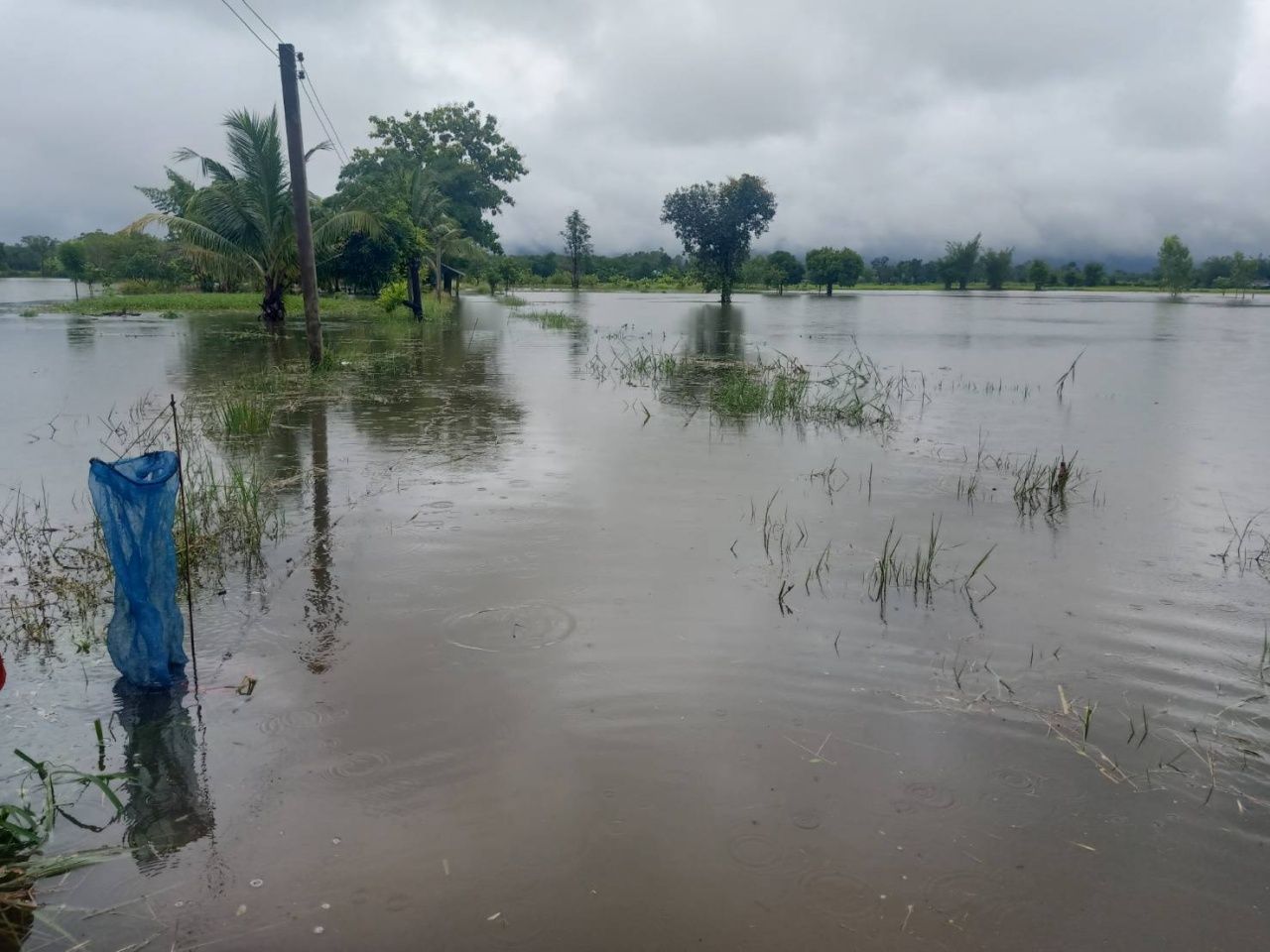 เช่นเดียวกับพื้นที่การเกษตรของชาวบ้านในอีก 2 ตำบล คือตำบลนาสะแบง และตำบลนาแสง อ.ศรีวิไล น้ำที่ไหลลงฝายห้วยทราย ซึ่งเป็นฝายขนาดเล็กของโครงการชลประทาน มีปริมาณมากจนล้นลำห้วยไหลเข้าท่วมพื้นที่การเกษตร ทั้งนาข้าว สวนยางพารา สวนปาล์มน้ำมัน กินพื้นที่กว้างนับพันไร่