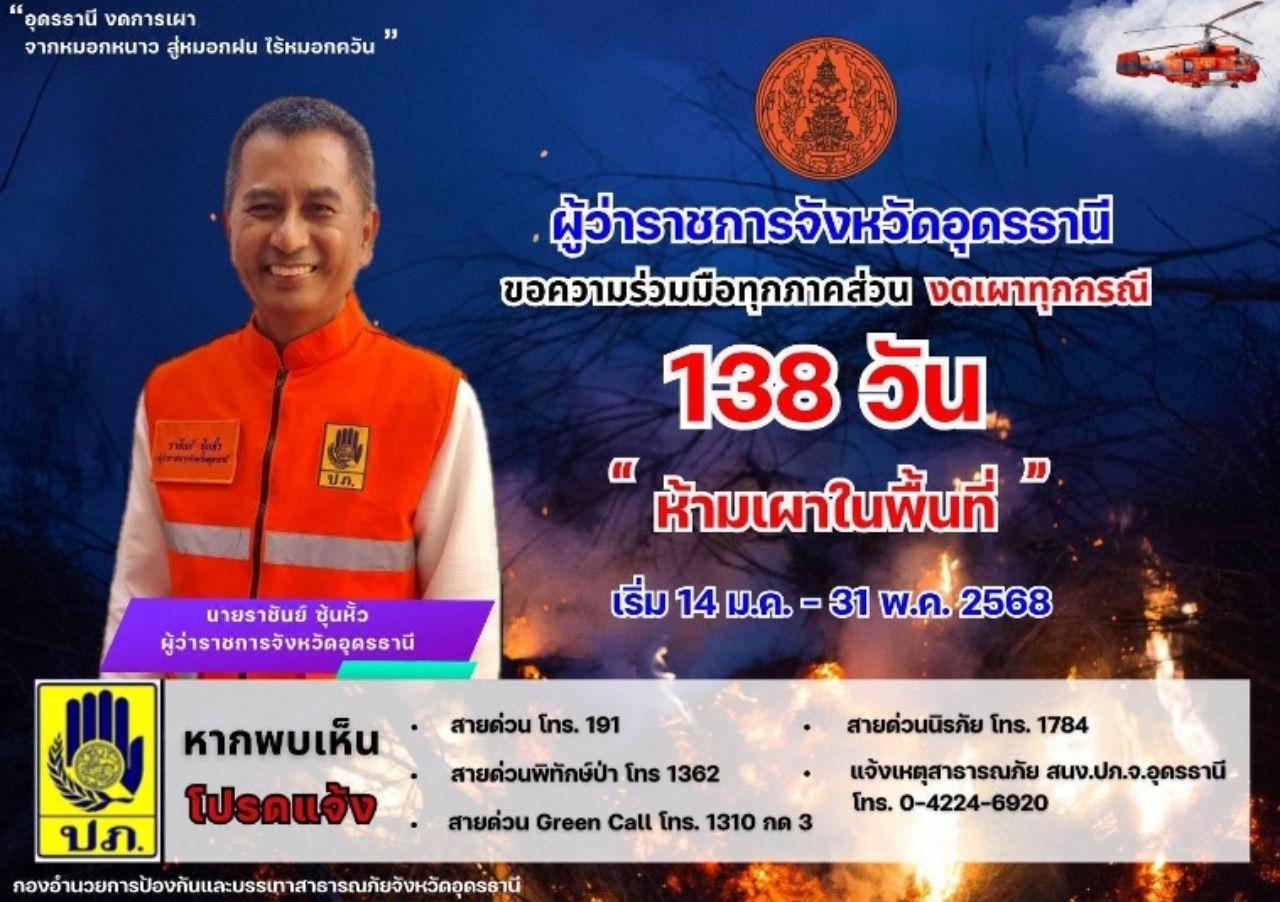 ทั้งนี้เนื่องจากนายราชันย์ ซุ้นหั้ว ผู้ว่าราชการจังหวัดอุดรธานี ได้เน้นย้ำ ให้นายอำเภอ เข้มงวดกวดขันปฏิบัติตามประกาศจังหวัดเรื่อง ขอความร่วมมือห้ามเผาโดยเด็ดขาดในพื้นที่จังหวัดอุดรธานี ประจำปี 2568 ประกาศจังหวัดอุดรธานี ห้ามทำการเผาในโล่งในพื้นที่จังหวัดอุดรธานีทุกกรณี เป็นระยะเวลา 138 วัน ตั้งแต่วันที่ 14 มกราคม -31 พฤษภาคม 2568 ผู้ฝ่าฝืนมีความผิดตามกฎหมาย พ.ร.บ.สาธารณสุข พ.ศ.2535 จำคุกไม่เกิน 3 เดือน ปรับไม่เกิน 25,000 บาท หรือทั้งจำทั้งปรับ