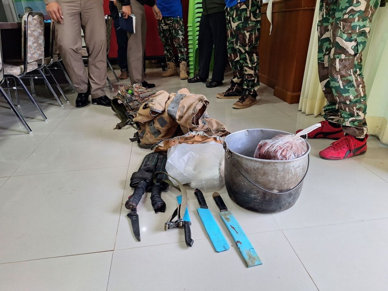 ขณะที่ของกลางที่ตรวจยึดมาได้บางส่วนจากการจับกุมคนล่ากระทิง ได้แก่ เนื้อกระทิง ประมาณ 10 กิโลกรัม มีด 5 เล่ม กระเป๋าเป้ 2 ใบ ซึ่งส่วนอนุรักษ์สัตว์ป่าได้มอบหมายให้นายสัตว์แพทย์ประจำสำนักบริหารพื้นที่อนุรักษ์ที่ 7 (นครราชสีมา) ร่วมตรวจสอบและเก็บตัวอย่างชิ้นเนื้อที่ตรวจยึดมาได้ ส่งสถาบันนิติวิทยาศาสตร์ กรมอุทยานแห่งชาติฯ เพื่อตรวจสอบยืนยันชนิดของชิ้นเนื้อให้แน่ชัดว่าเป็นเนื้อกระทิงหรือไม่ สำหรับข้อมูลรายละเอียดต่างๆ ของผู้ถูกกล่าวหา ทั้งผู้รับซื้อและผู้ล่า อยู่ระหว่างการสอบสวนขยายผลของพนักงานสอบสวน และจะรายงานให้ทราบต่อไป