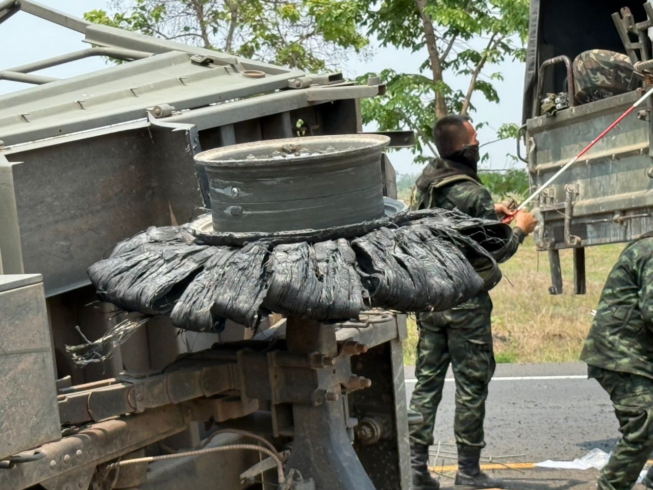 ที่เกิดเหตุพบรถจีเอ็มซี แบบ 4 ล้อหมายเลขกงจักร 92914 ของทหารจากค่ายสรรพสิทธิประสงค์ (มณฑลทหารบกที่ 22) จังหวัดอุบลราชธานี พลิกคว่ำลักษณะตะแคงอยู่ร่องกลางถนน มีทหารได้รับบาดเจ็บจำนวน 5 ราย ในจำนวนนี้บาดเจ็บสาหัส 4 นาย หน่วยกู้ภัยเร่งนำตัวส่งโรงพยาบาลประโคนชัย ตรวจสอบเบื้องต้นพบว่าล้อหลังขวา เหลือแต่ล้อกระทะกับซากยางรถยนต์ คาดว่าน่าจะถูกบดถูมาตามถนน