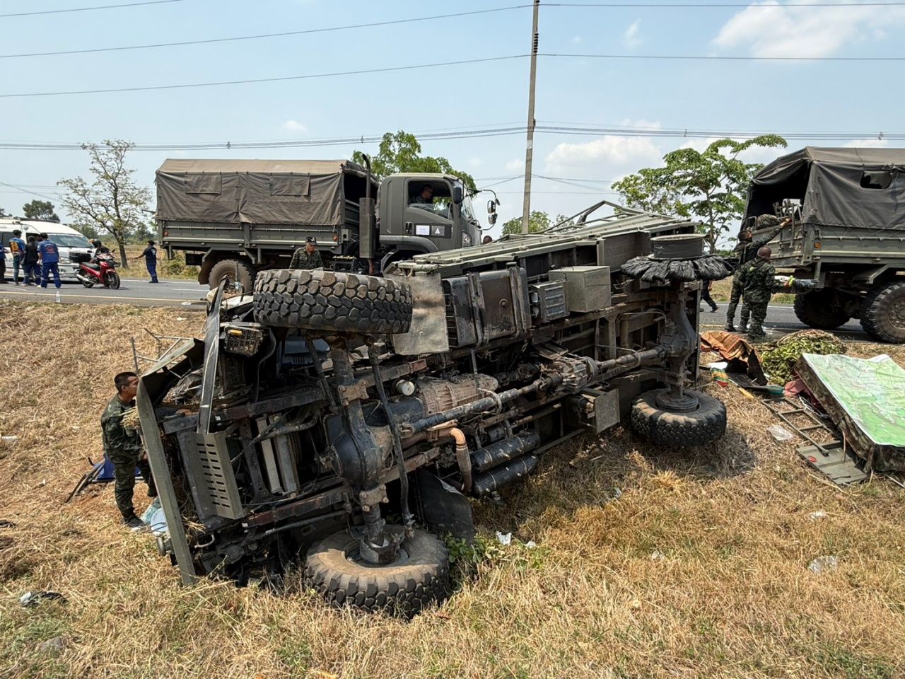 เมื่อเวลา 12.00 น. วันที่ 3 เม.ย. 68 พ.ต.ท.ศิริชัย เจริญศิริ สารวัตร (สอบสวน) สภ.ประโคนชัย อ.ประโคนชัย จ.บุรีรัมย์ รับแจ้งรถบรรทุกทหารพลิกคว่ำ ระหว่างหลักกิโลเมตรที่ 143-144 ถนนโชคชัย-เดชอุดม ขาเข้าตัวอำเภอประโคนชัย มีทหารได้รับบาดเจ็บหลายนาย จึงรุดไปตรวจสอบพร้อมกู้ภัยสว่างจรรยาธรรม จุด อ.ประโคนชัย กู้ภัยบ้านสองเมือง
