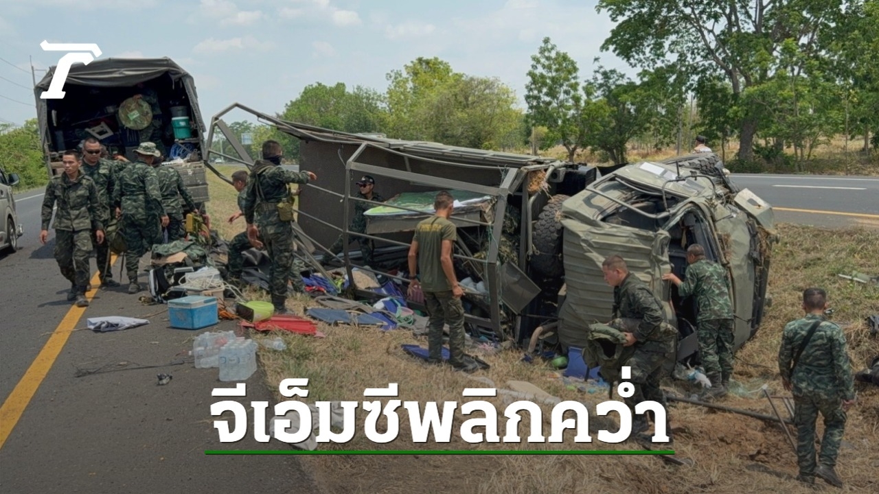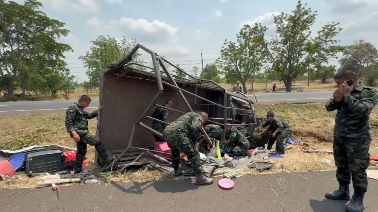 รถจีเอ็มซีพาทหารกลับจากการฝึก ยางระเบิด บังคับรถไม่อยู่ พลิกคว่ำลงข้างทาง ทหารเจ็บ 5 นาย ที่บุรีรัมย์ เจ้าหน้าที่เร่งนำตัวส่ง รพ.