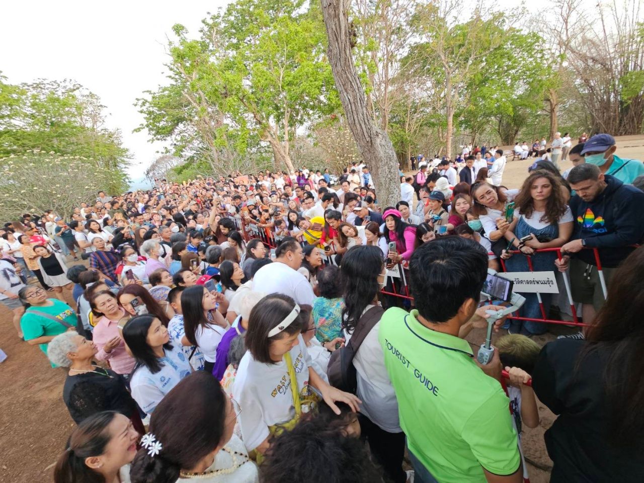 แต่เมื่อถึงช่วงเวลาประมาณ 06.00 - 06.10 น. ตามที่นักดาราศาสตร์ได้คำนวณและคาดการณ์ไว้ว่าดวงอาทิตย์จะขึ้นตรง 15 ช่องประตูปราสาทพนมรุ้ง นักท่องเที่ยวต่างตั้งตารอชมด้วยความตื่นเต้น แต่กลับมองเห็นดวงอาทิตย์สาดแสงส่องตรง 15 ช่องประตูปราสาทได้ไม่เต็มดวง เนื่องจากสภาพอากาศไม่เอื้ออำนวยมีเมฆหมอกบดบัง ทำให้นักท่องเที่ยวผิดหวัง แต่หลายคนบอกว่าแม้วันนี้จะมองไม่เห็นดวงอาทิตย์สาดแสงตรง 15 ประตูปราสาทตามที่ตั้งใจไว้ แต่ก็ถือโอกาสได้มาขอพรสิ่งศักดิ์สิทธิ์บนปราสาทพนมรุ้ง ก็เป็นมงคลแก่ชีวิตแล้ว ทั้งยังได้ชมความงดงามของปราสาทพนมรุ้ง และนักท่องเที่ยวบางส่วนก็ถือโอกาสพาครอบครัวมาเที่ยวชมงานประเพณีขึ้นเขาพนมรุ้งในช่วงวันที่ 4-6 เม.ย. 68 ด้วย
