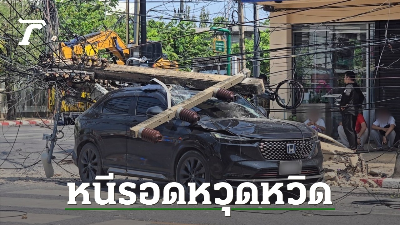 ระทึกกลางเมืองขอนแก่น รถเทรลเลอร์บรรทุกแบ็กโฮ เกี่ยว "สายไฟฟ้า" ทำเสาหักโค่นล้มทับเก๋ง 2 หนุ่ม รอดหวุดหวิด