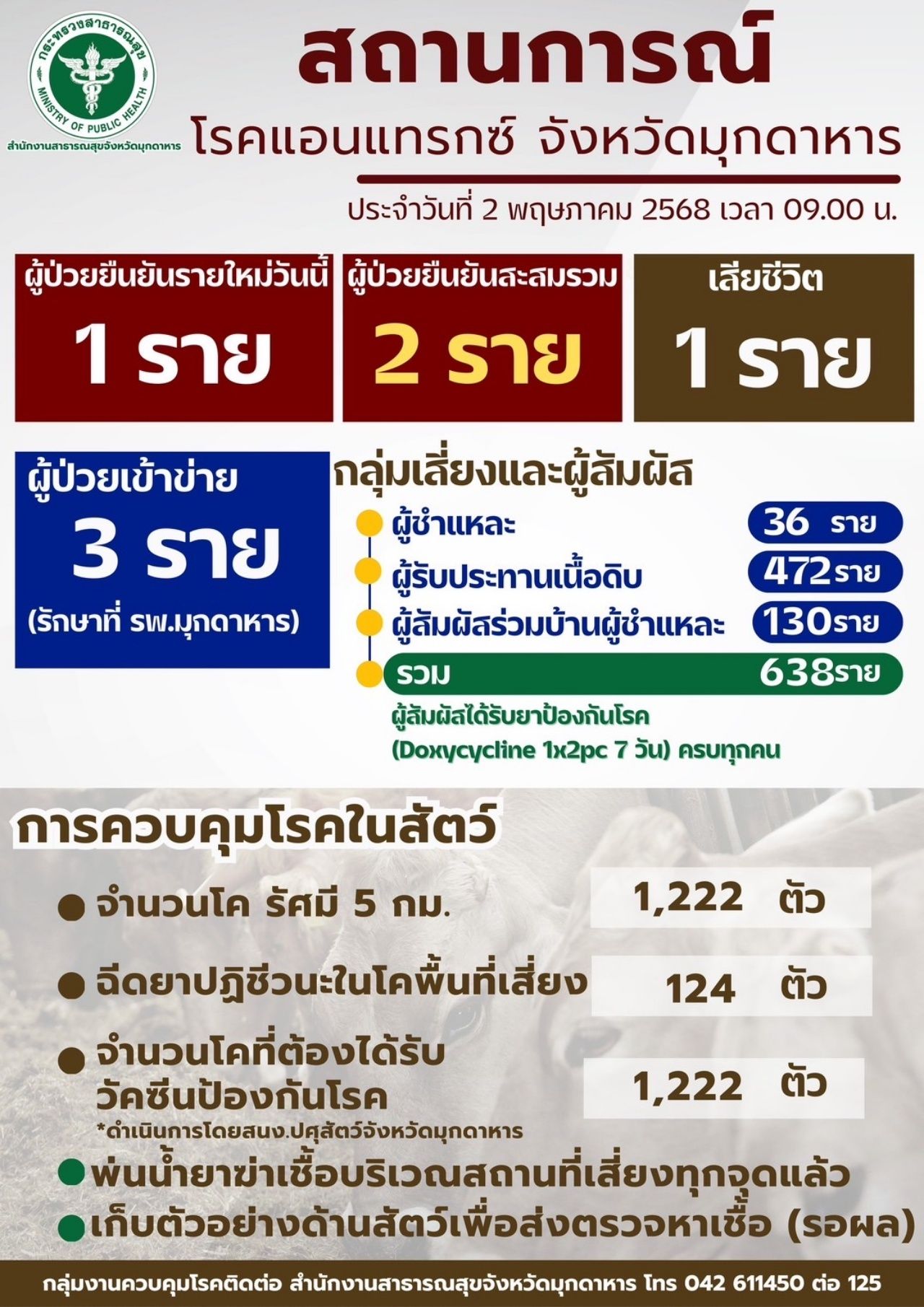 เมื่อวันที่ 2 พฤษภาคม 2568 นายแพทย์ณรงค์ จันทร์แก้ว สาธารณสุขจังหวัดมุกดาหาร และนายชาคริต ชุมจันทร์ นายอำเภอดอนตาล จังหวัดมุกดาหาร พร้อมหน่วยงานที่เกี่ยวข้อง เปิดเผยถึงสถานการณ์ผู้ป่วยโรคแอนแทรกซ์ในพื้นที่จังหวัดมุกดาหารว่า มีผู้เสียชีวิตจากโรคแอนแทรกซ์ 1 ราย เป็นรายเดิมที่เสียชีวิตไปก่อนหน้านี้ และมีผู้ป่วยที่ยังคงรักษาตัว 1 ราย ซึ่งตอนนี้จำนวนผู้ป่วยเข้าข่ายเป็นโรคแอนแทรกซ์มี 3 ราย ขณะนี้ได้เข้ารับการรักษาในโรงพยาบาลแล้ว