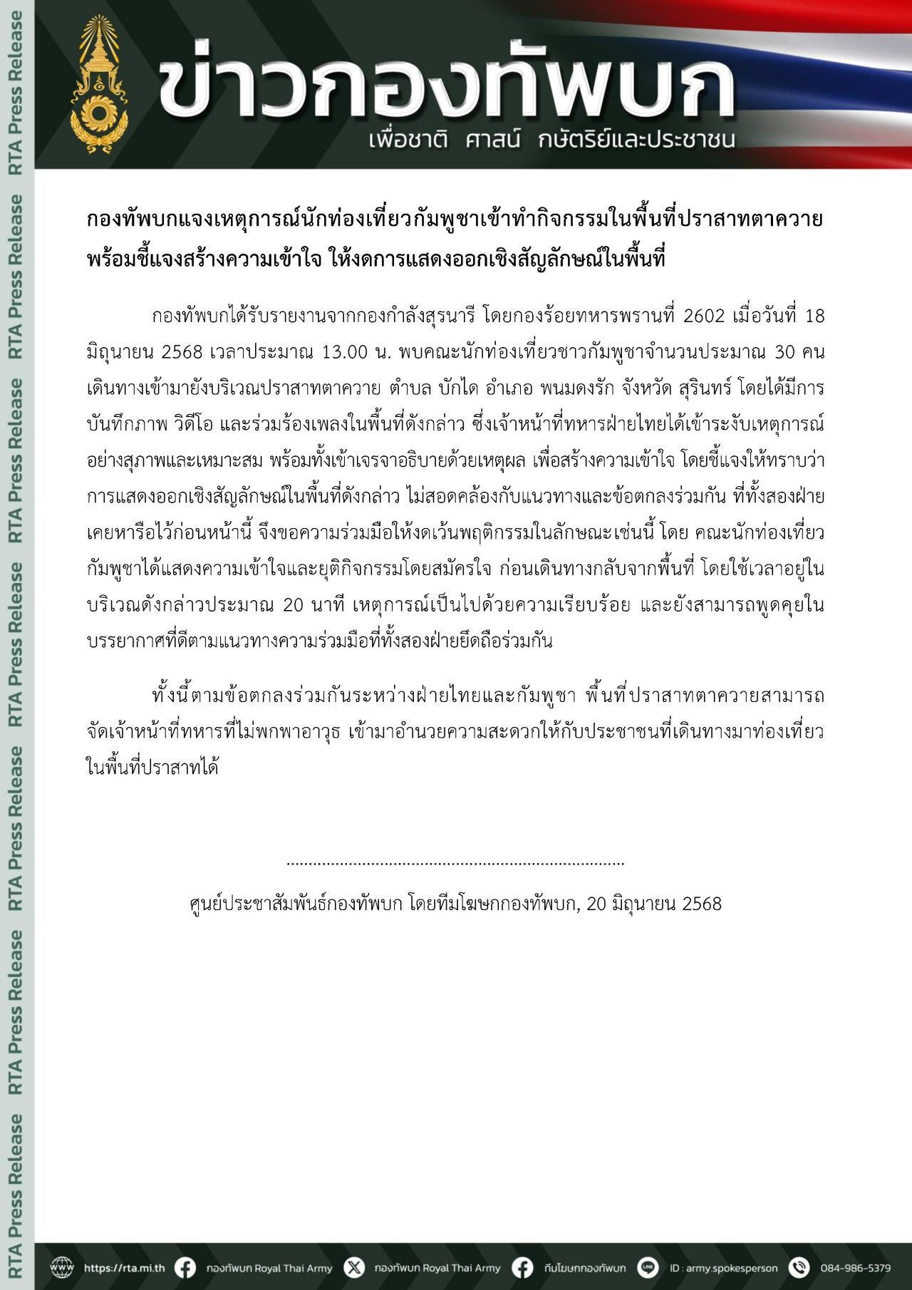 ล่าสุด กองทัพบกแจงเหตุการณ์ดังกล่าวโดยระบุว่ากองทัพบกได้รับรายงานจากกองกำลังสุรนารี โดยกองร้อยทหารพรานที่ 2602 เมื่อวันที่ 18 มิถุนายน 2568 เวลาประมาณ 13.00 น. พบคณะนักท่องเที่ยวชาวกัมพูชาจำนวนประมาณ 30 คน เดินทางเข้ามายังบริเวณปราสาทตาควาย ต.บักได อ.พนมดงรัก จ.สุรินทร์ โดยได้มีการบันทึกภาพ วิดีโอ และร่วมร้องเพลงในพื้นที่ดังกล่าว ซึ่งเจ้าหน้าที่ทหารฝ่ายไทยได้เข้าระงับเหตุการณ์อย่างสุภาพและเหมาะสม พร้อมทั้งเข้าเจรจาอธิบายด้วยเหตุผล เพื่อสร้างความเข้าใจ