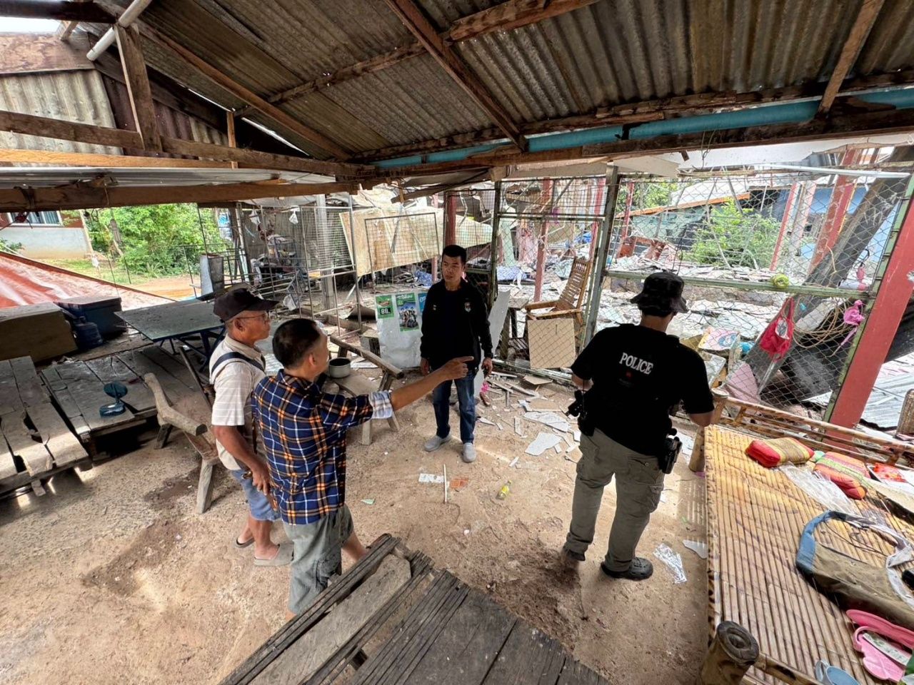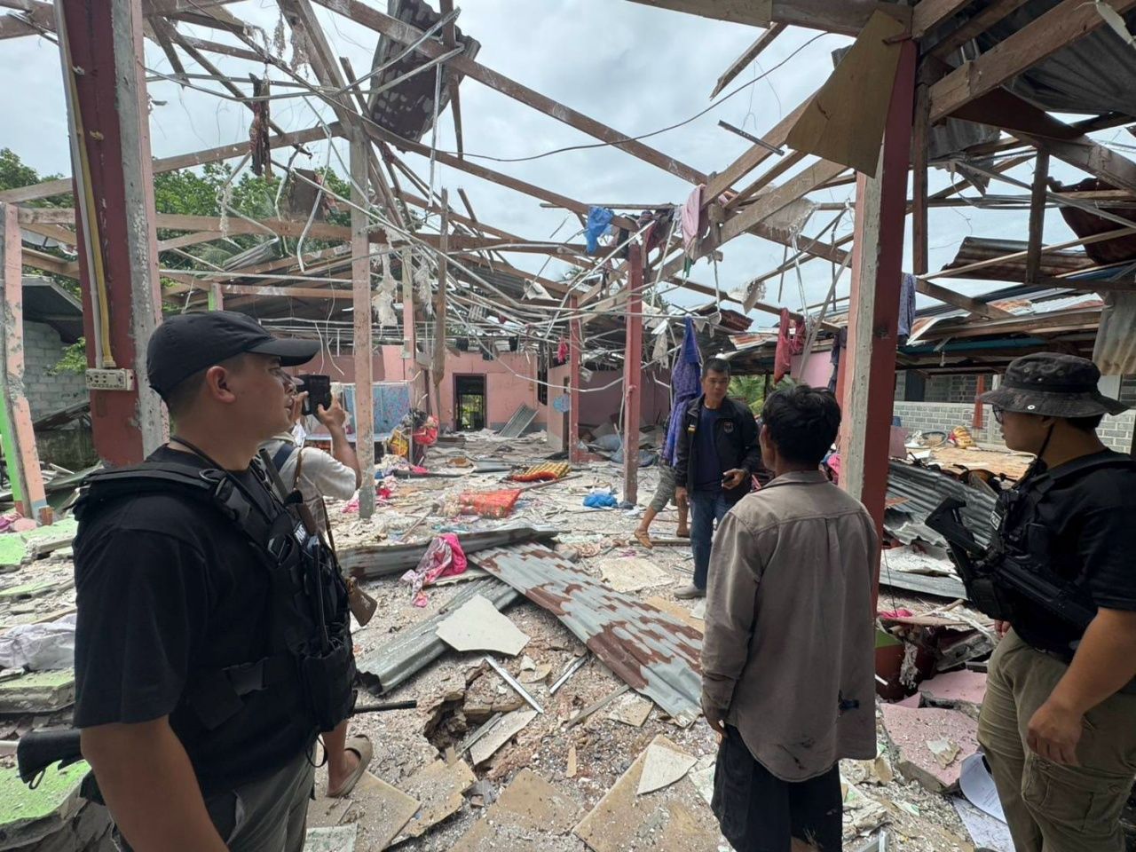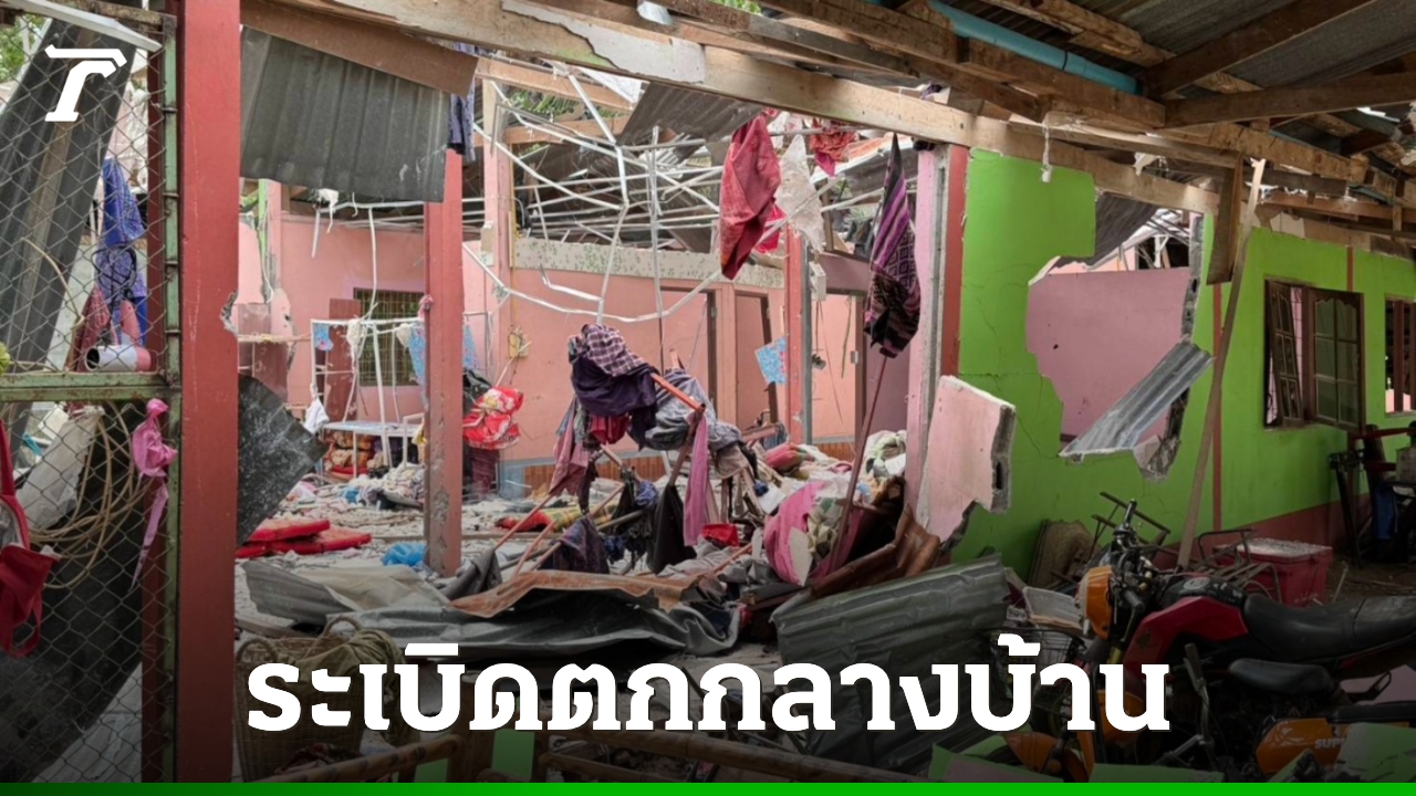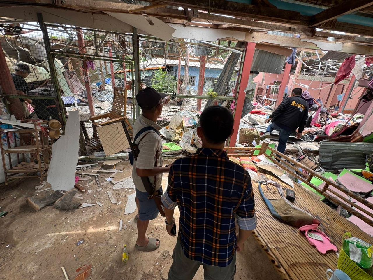 เจ้าหน้าที่เข้าตรวจสอบความเสียหาย ที่บ้านหลังหนึ่ง ใน อ.น้ำยืน หลังลูกระเบิดจากฝั่งกัมพูชายิงมาตกกลางบ้าน โชคดีไม่มีคนเจ็บ