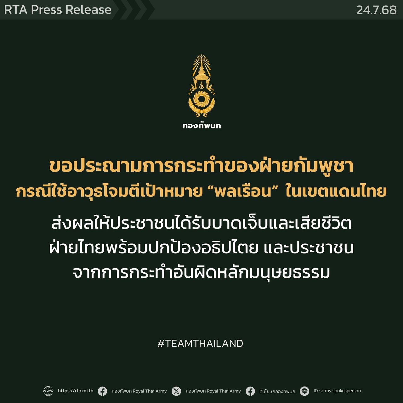 ทั้งนี้ กองทัพบกขอประณามการกระทำอันรุนแรงต่อเป้าหมายพลเรือนของฝ่ายกัมพูชา และพร้อมดำเนินการทางทหารเพื่อปกป้องอธิปไตยและประชาชนจากการกระทำอันผิดหลักมนุษยธรรมดังกล่าวอย่างถึงที่สุด