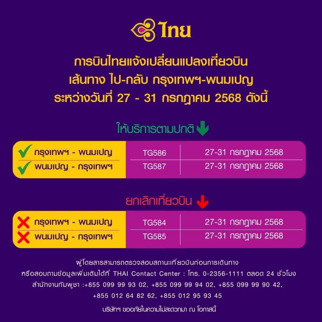 วันที่ 27 ก.ค. 68 มีรายงานว่า เพจเฟซบุ๊ก Thai Airways ได้โพสต์ประกาศ บริษัท การบินไทย จำกัด (มหาชน) ขอแจ้งเปลี่ยนแปลงการให้บริการเที่ยวบินในเส้นทาง ไป-กลับ กรุงเทพฯ–พนมเปญ ระหว่างวันที่ 27–31 กรกฎาคม 2568 ดังนี้
