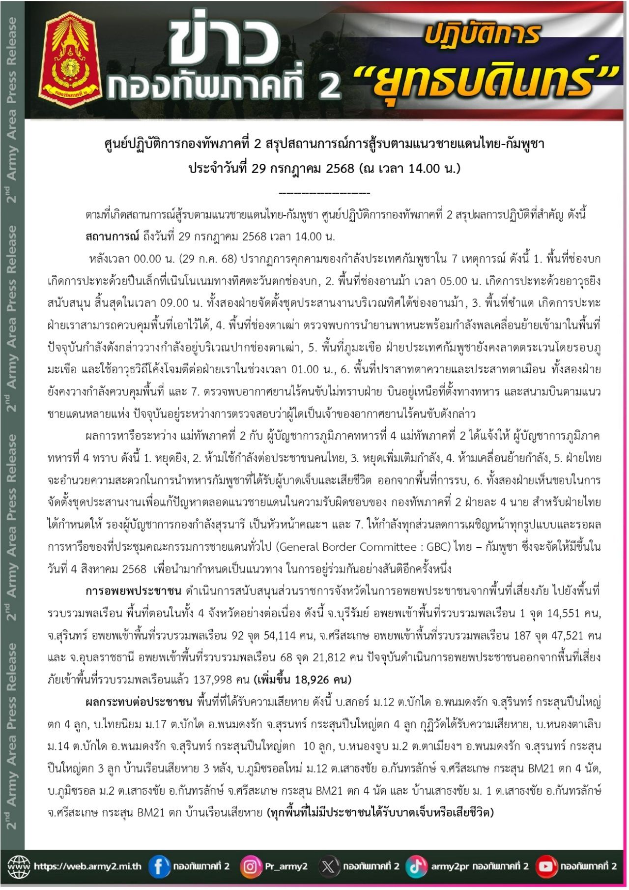 เวลา 14.30 น. วันที่ 29 กรกฎาคม 2568 ศูนย์ปฏิบัติการกองทัพภาคที่ 2 สรุปสถานการณ์การสู้รบตามแนวชายแดนไทย-กัมพูชา ประจำวันที่ 29 กรกฎาคม 2568 (ณ เวลา 14.00 น.)