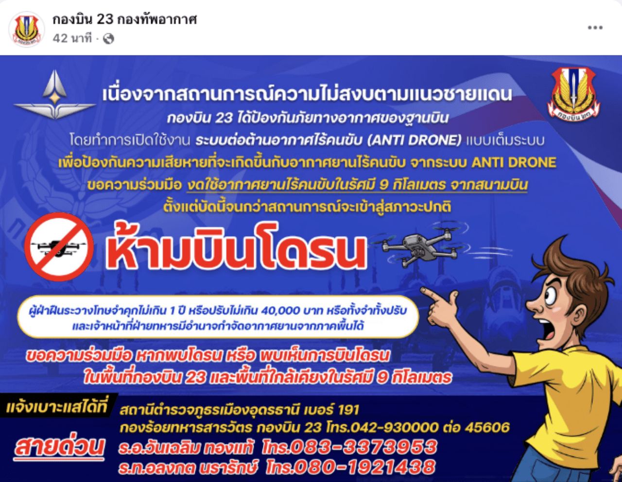 เช่นเดียวกับ เพจเฟซบุ๊ก "กองบิน 23 กองทัพอากาศ" ได้โพสต์ภาพระบุข้อความว่า เนื่องจากสถานการณ์ความไม่สงบตามแนวชายแดน กองบิน 23 ได้ป้องกันภัยทางอากาศของฐานบิน โดยทำการเปิดใช้งาน ระบบต่อต้านอากาศยานไร้คนขับ (Anti Drone) แบบเต็มระบบ เพื่อป้องกันความเสียหายที่จะเกิดขึ้นกับอากาศยานไร้คนขับ จากระบบ Anti Drone ขอความร่วมมือ งดใช้อากาศยานไร้คนขับในรัศมี 9 กิโลเมตร จากสนามบิน ตั้งแต่บัดนี้จนกว่าสถานการณ์จะเข้าสู่ภาวะปกติ