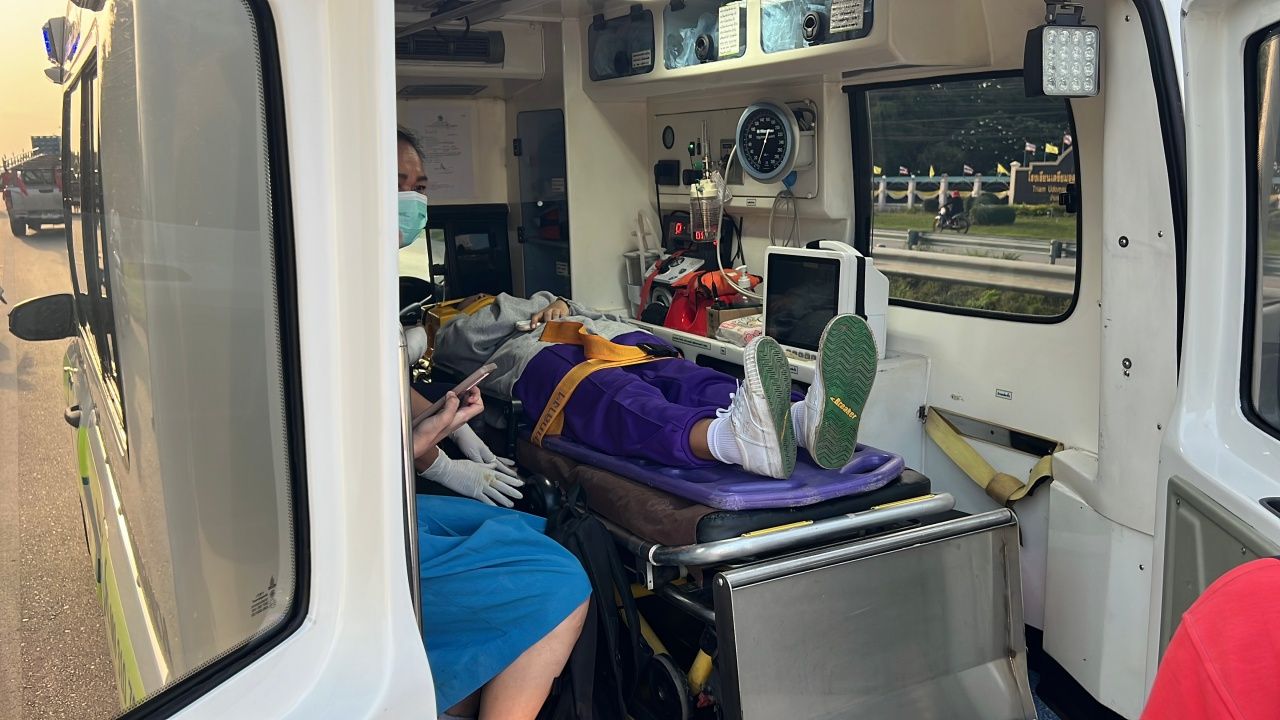 ตรวจสอบที่เกิดเหตุเป็นถนนขนาด 4 ช่องจราจร พบรถกระบะตอนครึ่ง โตโยต้า รีโว สีดำ ตกลงข้างทาง บริเวณหน้ารถมีรอยเฉี่ยวชนยุบพังเสียหาย ใกล้กันพบรถสองแถว โตโยต้า สีฟ้า พลิกตะแคงอยู่ริมถนน พบผู้บาดเจ็บเป็นนักเรียน 8 ราย ร้องไห้ด้วยความตกใจ มีบาดแผลบวมโนที่ศีรษะ ปวดแขนขา และมีบาดแผลถลอกฟกช้ำตามร่างกาย รู้สึกตัวดีทุกราย เจ้าหน้าที่เร่งให้การช่วยเหลือปฐมพยาบาลเร่งนำส่งโรงพยาบาลร้อยเอ็ด