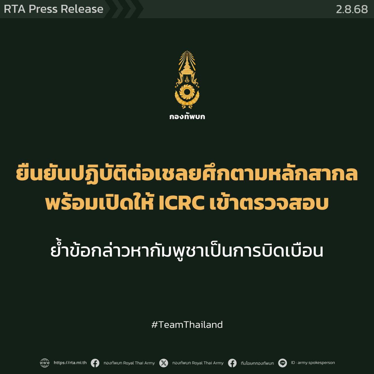 อย่างไรก็ตาม ประเทศไทยขอยืนยันว่า กองทัพบกได้ดำเนินการทุกขั้นตอนภายใต้กรอบของกฎหมายและหลักปฏิบัติสากลอย่างเคร่งครัด