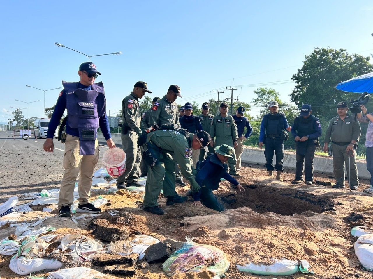 หน่วยเก็บกู้วัตถุระเบิด EOD ร่วมกับหน่วยปฏิบัติการพิเศษ ทำลายจรวด BM-21 ของกัมพูชา ตกกลางถนนที่ศรีสะเกษ ห่างจากปั๊มน้ำมันบ้านผือ 500 เมตร พร้อมเก็บเศษซากไปตรวจสอบเชิงเทคนิคเพิ่ม