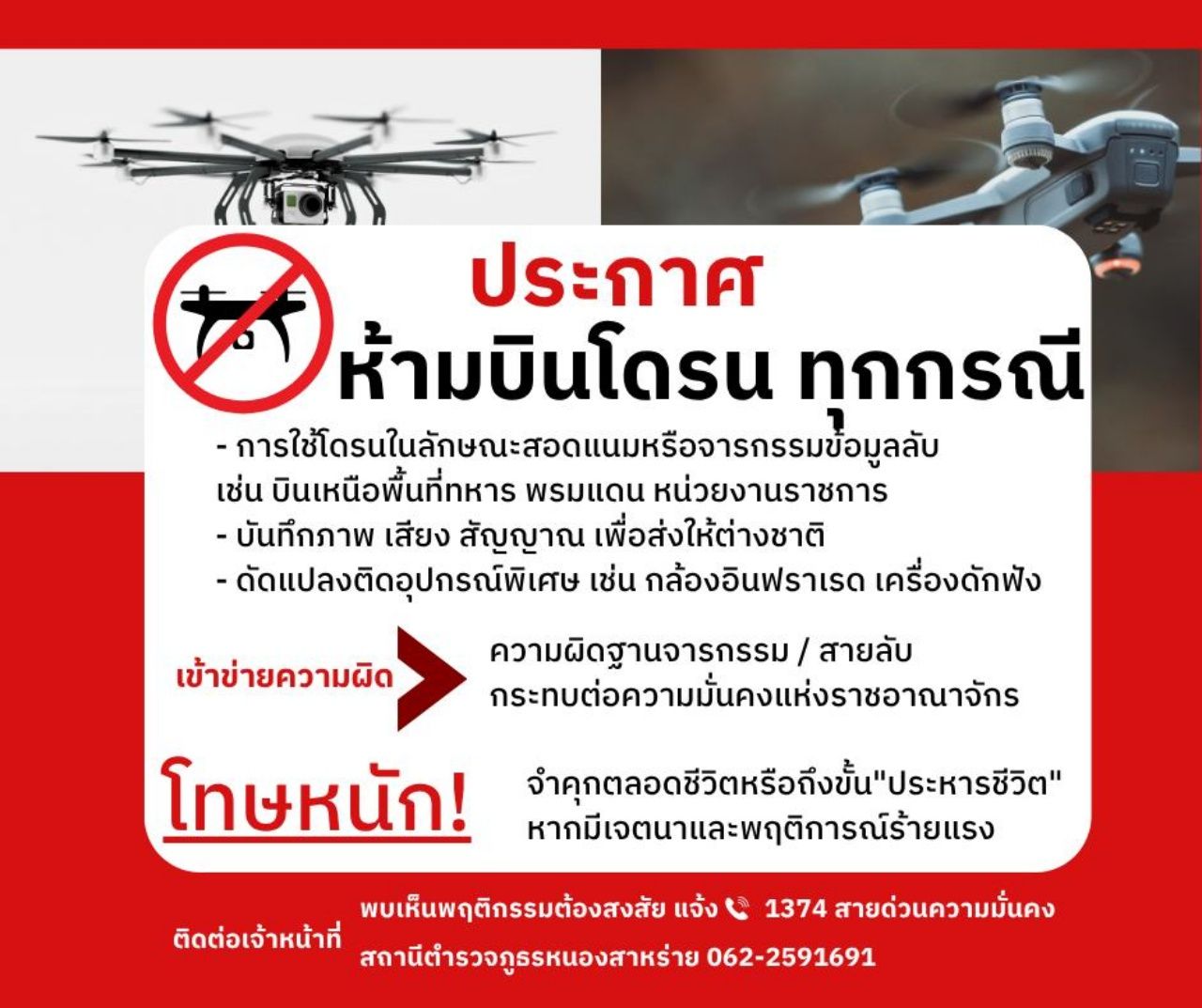 ซึ่งหน่วยงานที่เกี่ยวข้อง รวมถึง เจ้าหน้าที่ตำรวจ อย่างเช่น สภ.หนองสาหร่าย ก็ไม่ได้นิ่งนอนใจ ได้ออกตรวจตราเร่งแก้ไขปัญหา รวมถึงแจ้งเตือนไปยังพี่น้องประชาชนในพื้นที่ดูแลห้ามบินโดรนทุกกรณี เพราะจะมีความผิดฐานโจรกรรม สายลับ เพราะกระทบต่อความมั่นคงแห่งราชอาณาจักร หรือโทษหนัก จำคุกตลอดชีวิตหรือถึงขั้นประหารชีวิตหากมีเจตนาและพฤติการณ์ร้ายแรง