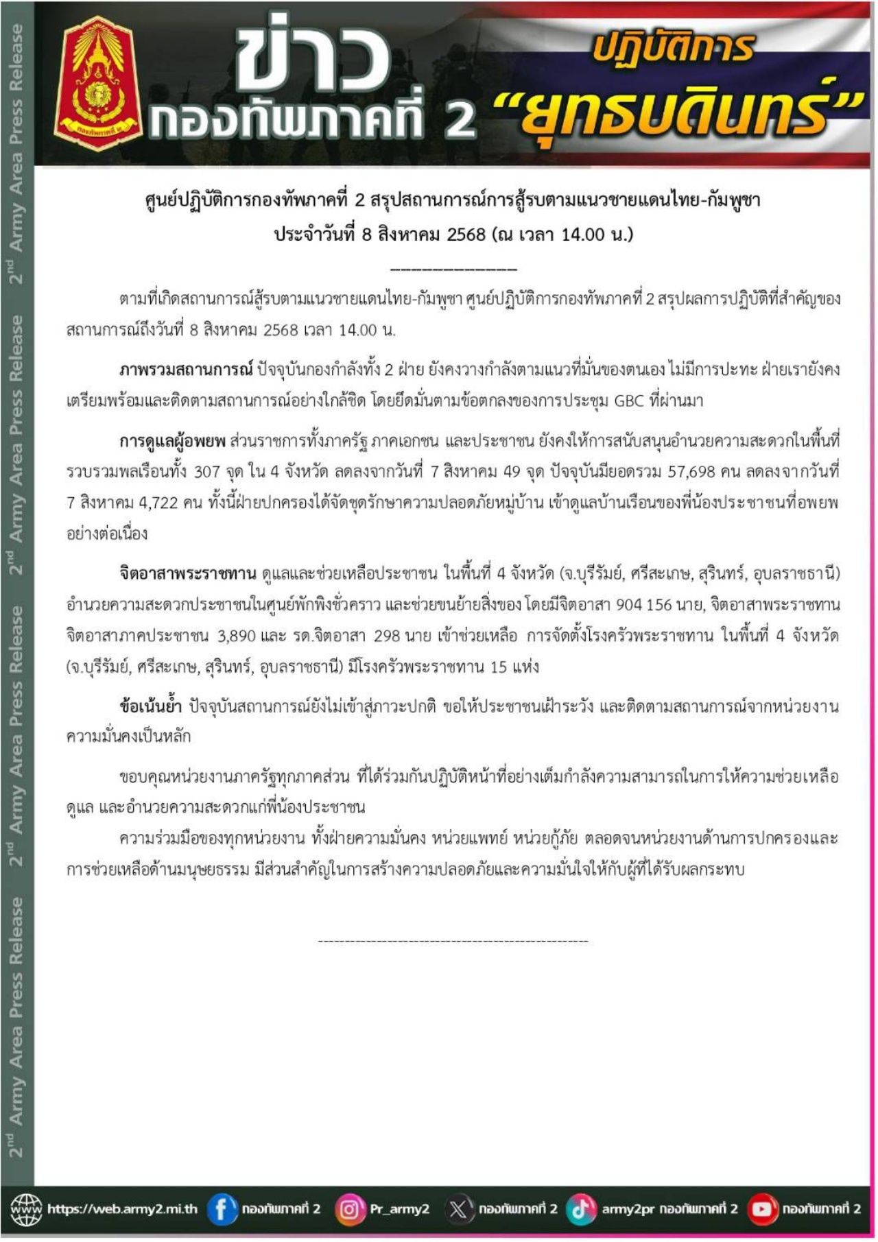 วันที่ 8 สิงหาคม 2568 ศูนย์ปฏิบัติการกองทัพภาคที่ 2 สรุปผลการปฏิบัติที่สำคัญของสถานการณ์สู้รบตามแนวชายแดนไทย-กัมพูชา เวลา 14.00 น. พบว่า ภาพรวมสถานการณ์ ปัจจุบันกองกำลังทั้ง 2 ฝ่าย ยังคงวางกำลังตามแนวที่มั่นของตนเอง ไม่มีการปะทะ ฝ่ายเรายังคงเตรียมพร้อมและติดตามสถานการณ์อย่างใกล้ชิด โดยยึดมั่นตามข้อตกลงของการประชุม GBC ที่ผ่านมา