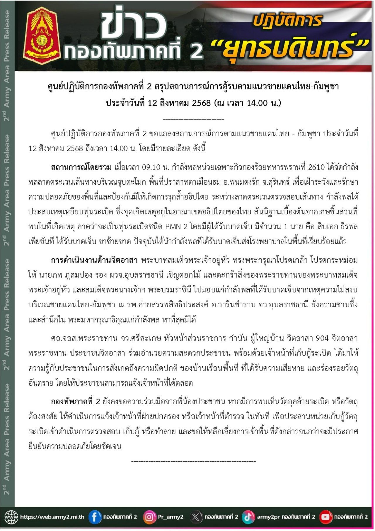 วันที่ 12 สิงหาคม 2568 ศูนย์ปฏิบัติการกองทัพภาคที่ 2 แถลงสถานการณ์การตามแนวชายแดนไทย - กัมพูชา ประจำวันที่ 12 สิงหาคม 2568 ถึงเวลา 14.00 น. โดยมีรายละเอียด ดังนี้
