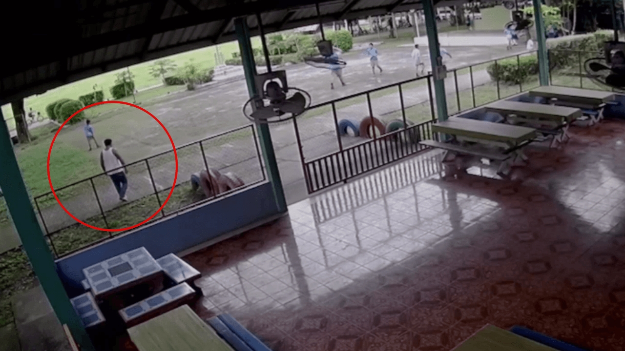 เมื่อเจ้าหน้าที่ไปถึง ไม่พบตัวชายคนดังกล่าว ซึ่งได้หลบหนีออกไปจากโรงเรียนแล้ว จากการตรวจสอบกล้องวงจรปิดในโรงเรียน พบว่าชายคนดังกล่าวเดินเข้ามาจากช่องว่างรั้วปูนข้างโรงเรียน เดินผ่านโรงอาหาร และเข้ามาตะโกนโวยวายด่าทอเด็กนักเรียน และวิ่งไล่กวด ทำให้เกิดความตื่นตกใจ เด็กนักเรียนต่างวิ่งหนีชายคนดังกล่าวไปคนละทิศละทาง ทราบชื่อภายหลังคือ นายสิทธิภูมิ อินทร์ทอง หรือ แอ๋ อายุ 50 ปี ชาวบ้านบ้านงอย ที่มีบ้านอยู่ห่างจากโรงเรียนไปประมาณ 500 เมตร