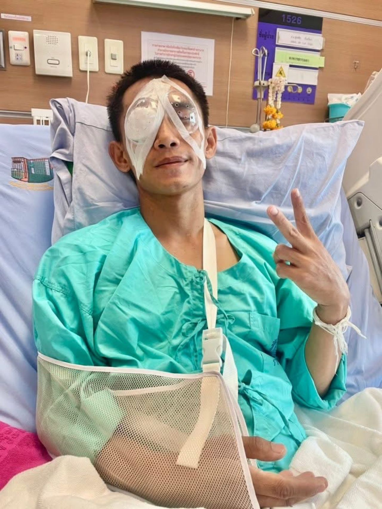 ตนโดนสะเก็ดระเบิดเข้าที่ลูกตาทั้ง 2 ข้าง จนมองเห็นมัวไปหมด และแขนข้างขวาโดนสะเก็ดระเบิดจนกระดูกหักตอนแรกตนคิดว่าแขนขาดไปแล้ว ตนตั้งสติได้จึงร้องบอกให้เพื่อน ๆ ดึงตัวเข้าที่กำบัง จากนั้นเรียกหน่วยพยาบาลเข้าช่วยเหลือนำส่งโรงพยาบาล อาการตอนนี้ดีขึ้นแล้วหมอให้ออกจากโรงพยาบาลมารักษาตัวที่บ้านตั้งแต่วันที่ 29 ส.ค. ที่ผ่านมา หมอได้ผ่าตัดเอาสะเก็ดระเบิดออกจากตาทั้ง 2 ข้างได้อย่างปลอดภัย ตาข้างขวามองเห็น 100% แล้วแต่ตาข้างซ้ายยังมัวอยู่นิดหน่อย ต้องใช้น้ำตาเทียมหยอด ส่วนแขนหมอได้ทำการผ่าตัดใช้เหล็กดามกระดูก โดยต้องผ่าตัดเย็บถึง 3 ชั้น กว่า 100 เข็ม ตอนนี้ก็เริ่มแข็งแรงขึ้นเรื่อย ๆ