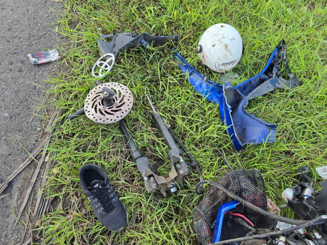 ใกล้กันพบรถจักรยานยนต์ ยี่ห้อฮอนด้าเวฟ สีน้ำเงิน ทะเบียน บุรีรัมย์ สภาพพังยับเยิน ชิ้นส่วนอะไหล่รถจักรยานยนต์แตกหักกระเด็น กระจายเกลื่อนทั่วบริเวณ