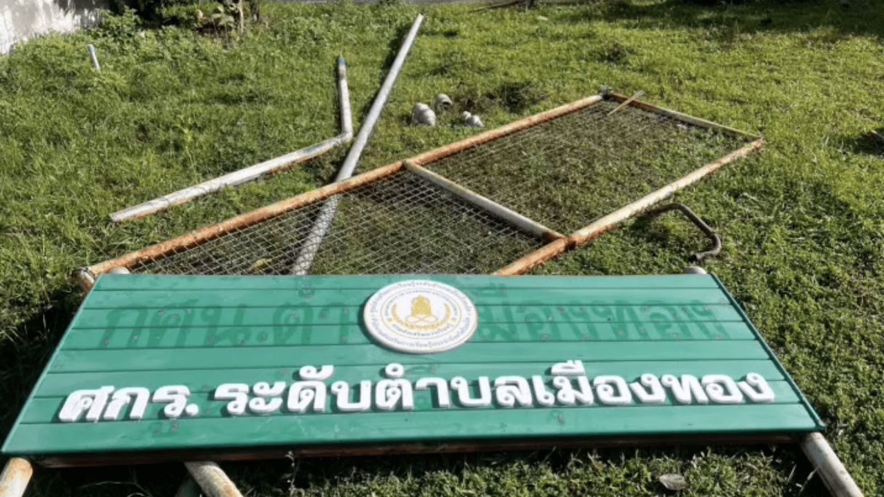 ที่เกิดเหตุเป็นสำนักงาน อบต.เมืองทอง เก่า พบเสาธงยาว 4 เมตร 1 ต้น ป้ายเหล็กส่งเสริมการเรียนรู้ และแผงเหล็กหายไป โดยหลังจากตรวจที่เกิดเหตุเสร็จ เจ้าหน้าที่ก็ทราบตัวผู้ก่อเหตุ จึงออกไปตรวจสอบจนพบตัว ทราบชื่อคือนายนิวัฒน์ ทองเภา อายุ 38 ปี พร้อมด้วยของกลางทั้งหมดกองอยู่หน้าบ้าน