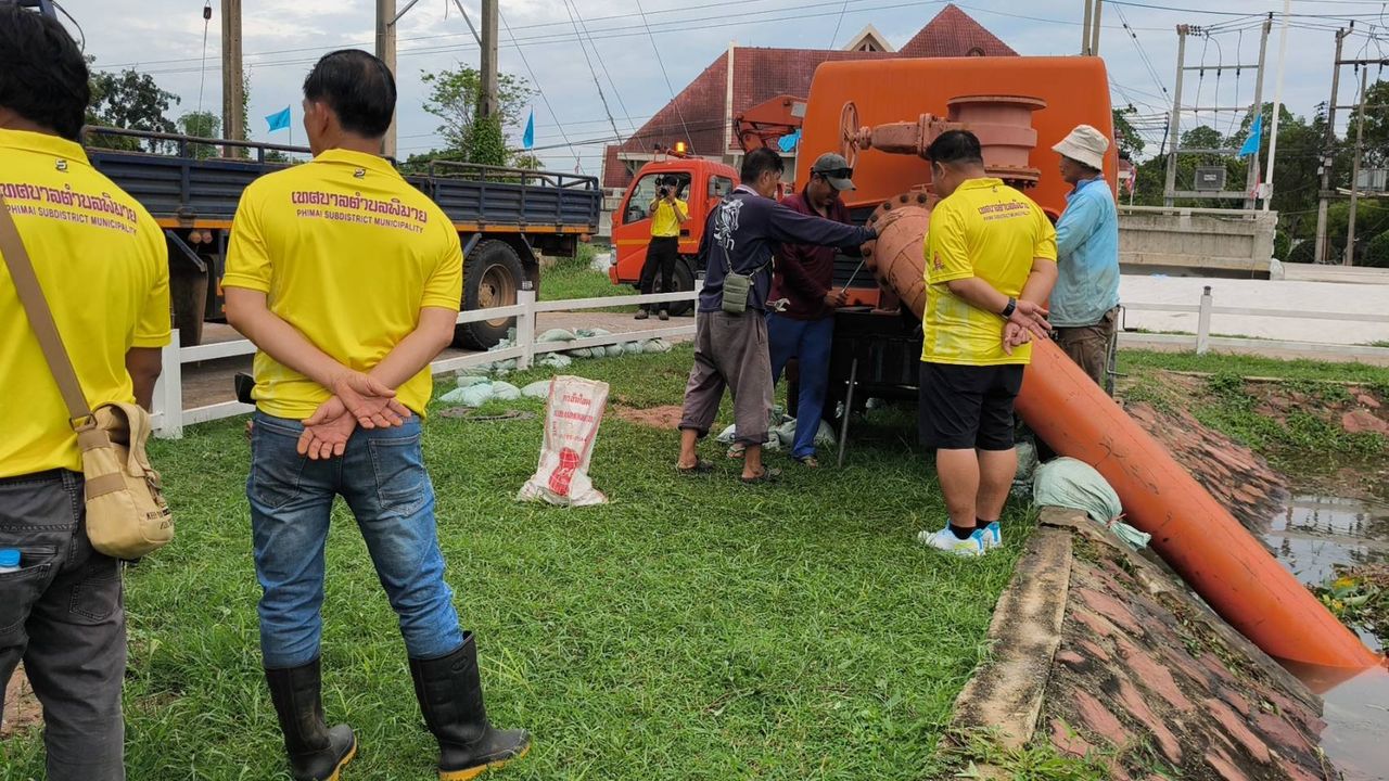ปริมาณน้ำฝนที่ตกสะสมเหนือเขื่อนพิมายทุกวัน ส่งผลทำให้ปริมาณน้ำเริ่มที่จะเอ่อล้นเข้าไปท่วมบ้านเรือนของชาวบ้าน ในเขตเทศบาลตำบลพิมาย ทางเจ้าหน้าที่กองช่างเทศบาลตำบลพิมาย จึงได้นำเครื่องสูบน้ำมาติดตั้ง เพื่อสูบน้ำที่ไหลเข้าไปในเขตเทศบาลตำบลพิมายออก เพื่อป้องกันน้ำท่วมแหล่งเศรษฐกิจ และโบราณสถาน ปราสาทหินพิมาย พิพิธภัณฑสถานแห่งชาติพิมาย หลังจากปริมาณน้ำเพิ่มสูงขึ้นอย่างรวดเร็ว