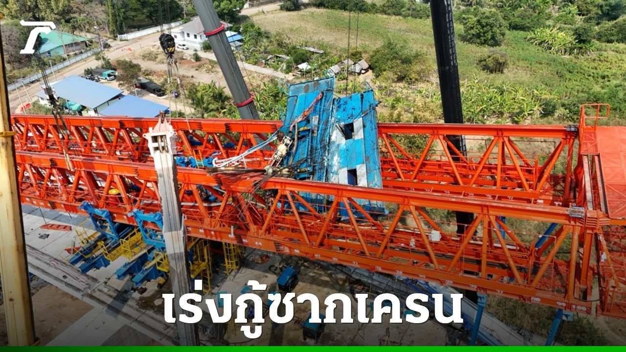 เจ้าหน้าที่พร้อมคนงาน เร่งกู้ซากเครน หล่นทับรถไฟ ที่สีคิ้ว เพื่อคืนพื้นที่ให้ รฟท. นำรางใหม่เข้าเปลี่ยน เผยสาเหตุล่าช้า ขณะตัดโลเวอร์ลิ่งเครน พบมีน้ำมันไหลออกมาจากชิ้นส่วน