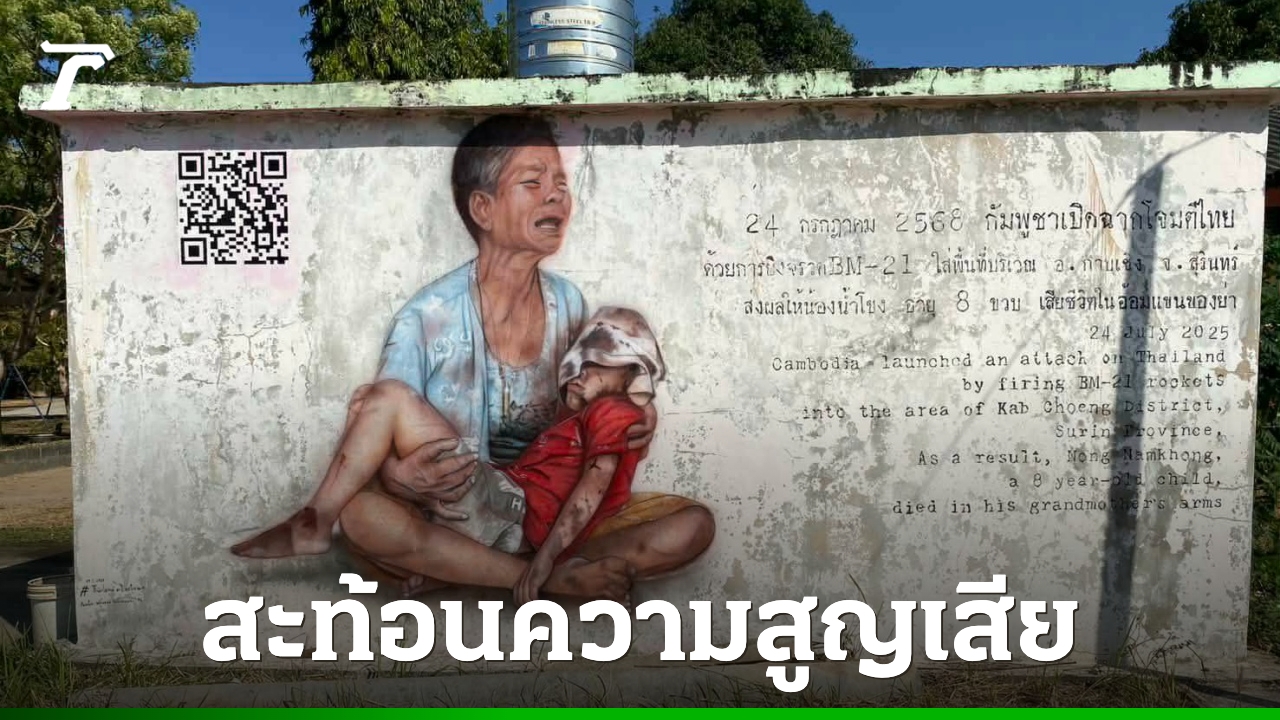 วันที่ 22 ก.ค.68 นายสุธีร์ บุญแต่ง อายุ 60 ปี และนางสะทน กันภัย อายุ 63 ปี ปู่และย่าของ ด.ช.ธิติวัฒน์ บุญแต่ง อายุ 8 ขวบ หรือ น้องน้ำโขง เหยื่อจรวด BM-21 กัมพูชาที่ยิงตกใส่บ้านเสียชีวิต จากเหตุปะทะชายแดนไทย-กัมพูชา ได้กล่าวขอบคุณกลุ่มศิลปินไทยหัวใจรักชาติ ซึ่งเป็นคณะทำงานปฏิบัติการตอบโต้ทางศิลปะ ที่วาดภาพ 46 วีรบุรุษทหารกล้าผู้เสียสละพิทักษ์ผืนแผ่นดินไทย บนผนังห้องเรียน ห้องน้ำและแท็งก์น้ำ ภายในโรงเรียนบ้านไทยสันติสุข ต.บักได อ.พนมดงรัก จ.สุรินทร์